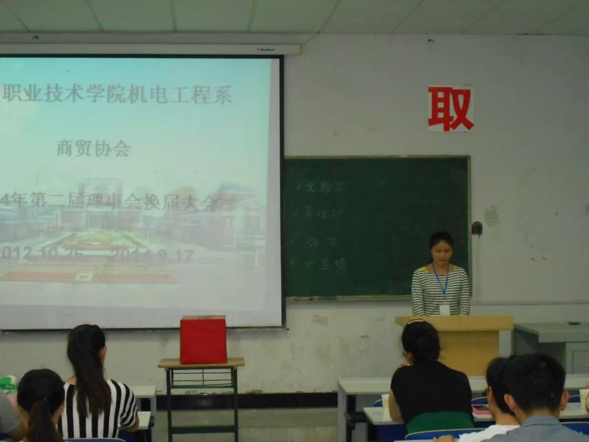 本次换届通过公开竞选、民主投票选举的方式选举出一名会长一名,两名副会长,新一届理事会成员由上一届理事会成员协商产生。经过激烈的竞选最终产生新一届的负责人,由土木系张飞同学担任会长,机电系计亚齐同学、经贸系葛双双同学担任副会长。随后,上一届商贸协会会长童玲同学对上学年商贸协会的工作做了述职报告。2012年10月26号到今天20134年9月17号,我们用两年的时间明白了什么是责任,理想与坚持。