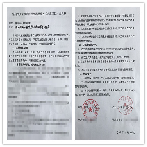 去年年底,我系志愿者与滁州市儿童福利院进行接触,向其表明我系愿意长期为儿童福利院提供志愿服务,贵院领导表示支持。在此期间,双方就服务地点、服务内容、服务时间、权利与义务等事项进行了讨论,最终达成一致并签订协议。