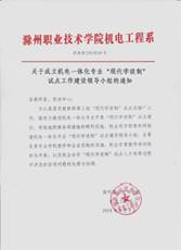 2018年8月学校贯彻落实《教育部关于开展现代学徒制试点工作的意见》等文件精神,申报并成功获批教育部第三批现代学徒制试点院校。学校领导高度重视试点工作,成立了“现代学徒制试点工作领导小组”,项目建设主要承接院部电气工程学院(原机电系)在招就处、教务处、财务处等部门的大力支持下,与博西华家用电器有限公司、全柴动力股份有限公司及滁州惠科光电科技有限公司3家大型企业合作,依托“机电一体化专业”(申报专业)开展现代学徒制合作培养工作,其中学校与博西华家用电器有限公司有连续21年的德国“双元制”合作办学基础,滁州惠科光电科技有限公司为滁州市建市以来投资最大的企业。