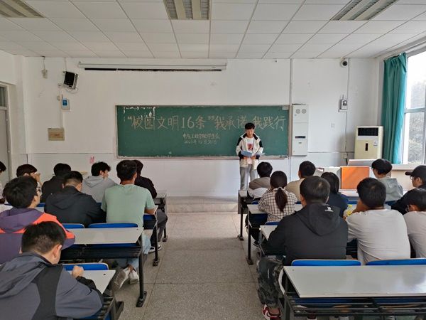 学生会主席栗豪领学“校园文明十六条”内容,强调了“校园文明十六条”与学风建设的重要性,引导学生树立良好的精神风貌,培养良好的文明素养,从而全面提高学生的整体素质,创造良好的校园文明氛围。