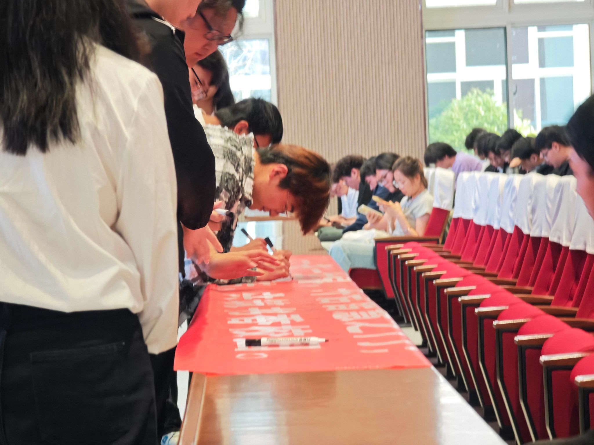 活动尾声,师生们在“一书一世界,开启智慧之门;一笔一承诺,共筑书香校园”的条幅上签名,表达对阅读的热爱与承诺。