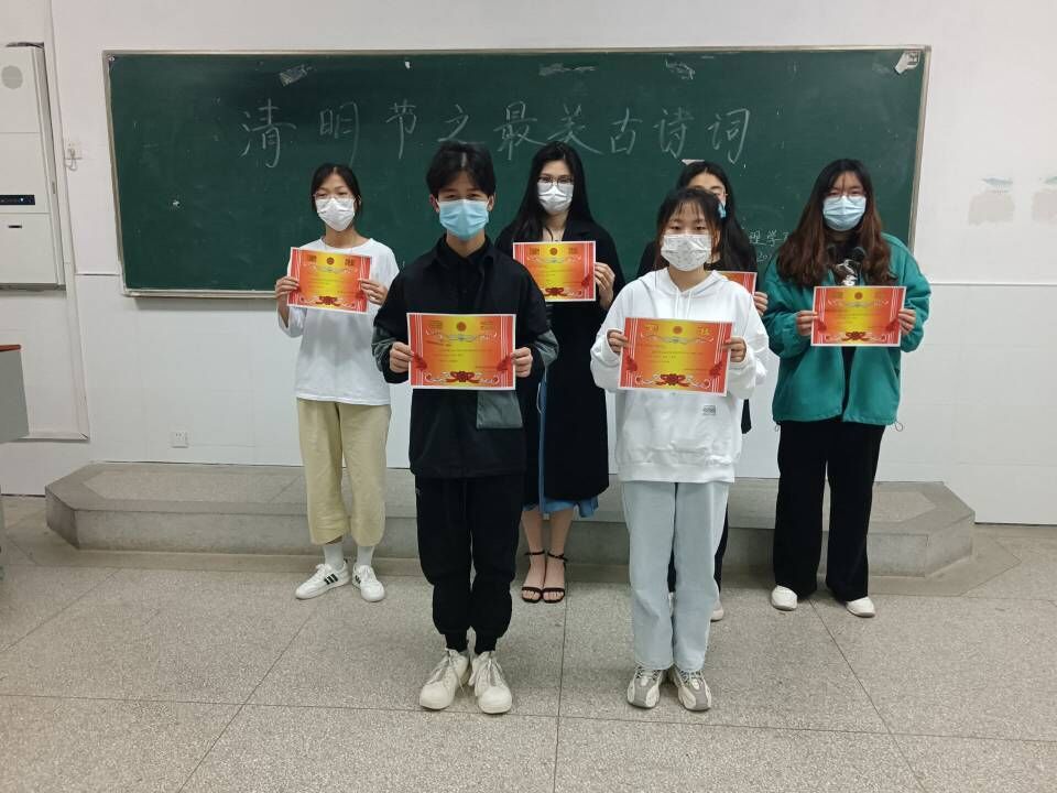 每位选手伴着悠扬的音乐,饱含深情地朗诵诗词,领略传统文化之美。朗诵结束后,评委们都会给予选手们一些建议及意见。经过一个多小时的激烈比拼后,最终由21旅管2班方鑫苗同学朗诵的《寒食野望吟》荣获一等奖,21会计4班扬红运同学、吴微同学和扬静同学朗诵的《三台清明应制》;21财管2班的王松雪同学、谢秀梅同学和洪振同学朗诵的《虞美人》荣获二等奖;21会计三班刘雨飞同学朗诵的《清明》,21会计一班高正玲同学、余倩同学朗诵的《清明》和21旅管二班张默默同学、刘莹莹同学、王娟同学朗诵的《折挂令·客窗清明》荣获三等奖。