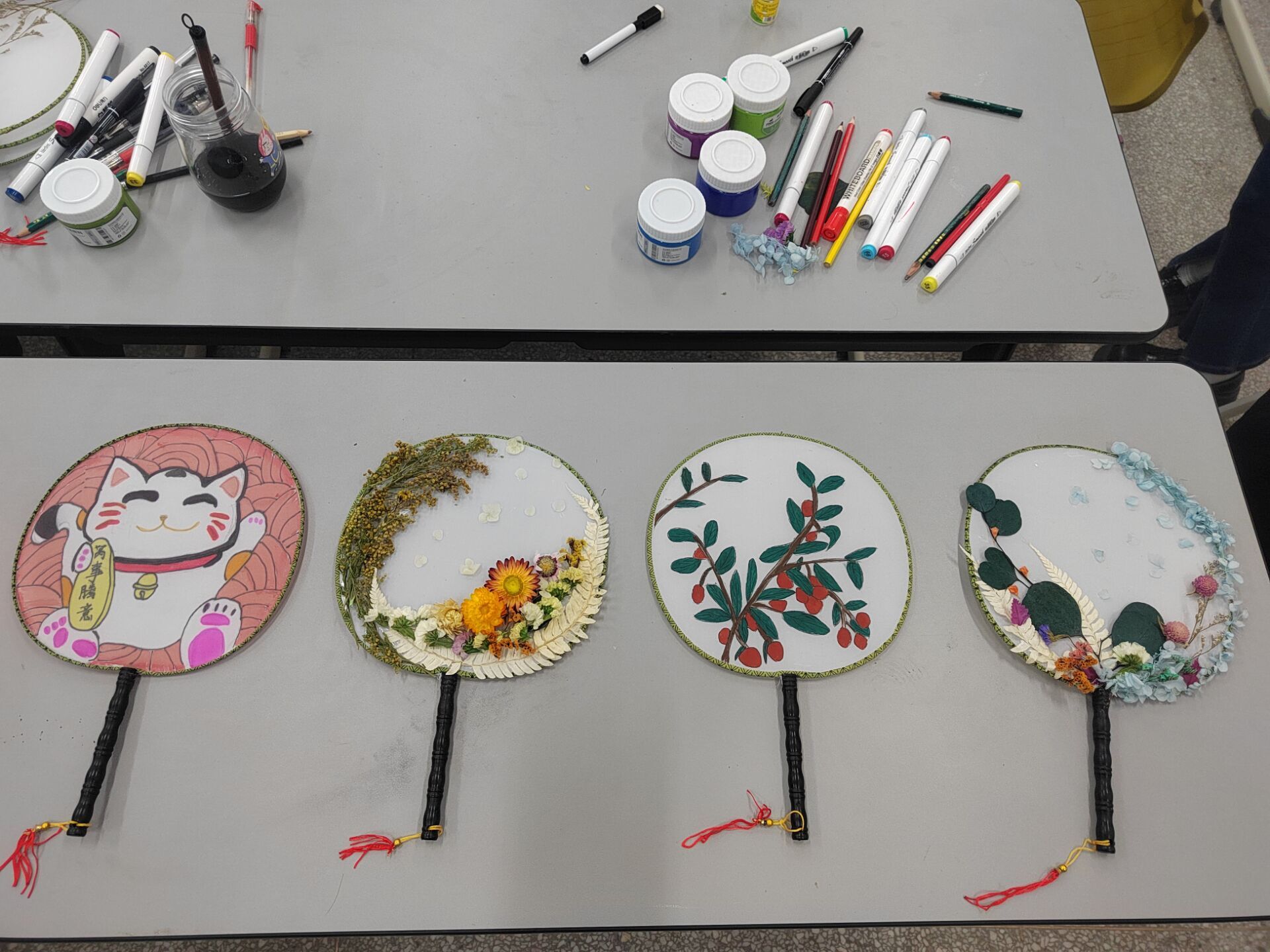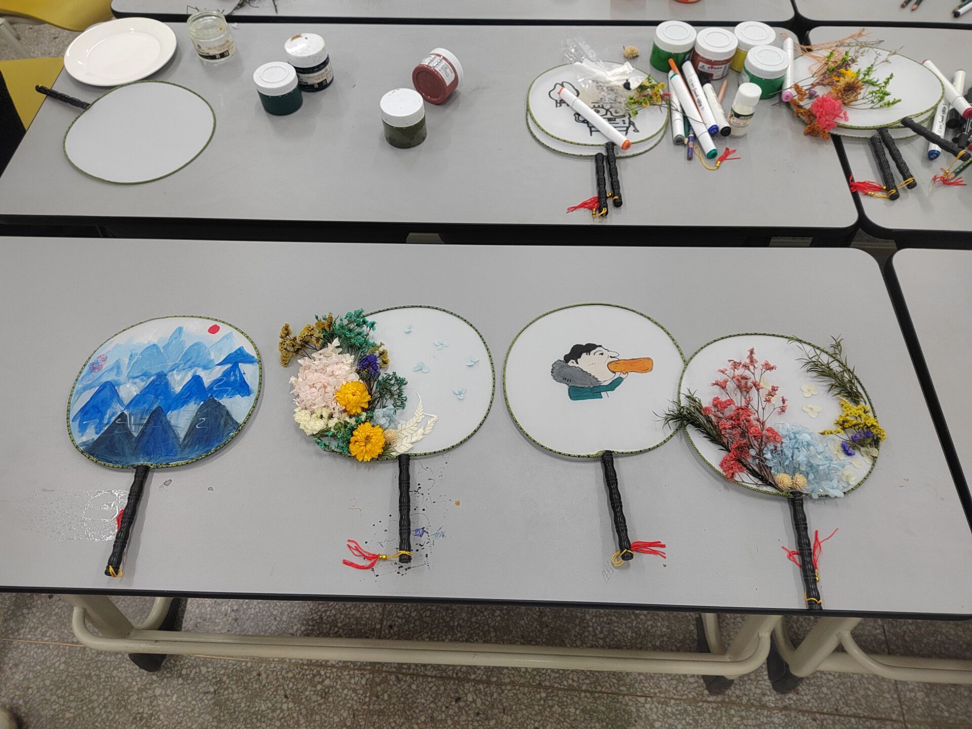 比赛过程中,大家结合团扇的特征、发挥自己的想象力和创造力,制作出了精美的团扇。经过评审,在众多作品中荣获一等奖的是赵甜甜同学的作品、获得二等奖的是高瑞瑞同学的作品和王娜茹同学的作品,获得三等奖的是陶萍同学的作品、柯如梦同学的作品和石春桃同学的作品。现场比赛结束后,同学们将所有获奖作品进行展出。