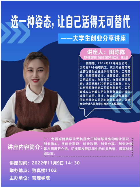 为推动大众创业、万众创新走深走实,激发大学生群体的创业热情,促进大学生更加充分更高质量就业,根据《金沙威尼斯欢乐娱人城优秀创业者进校园宣讲活动方案》的要求,11月9日下午,管理学院特邀滁州市甜甜财务咨询服务有限公司总经理田陈陈为我院2023届毕业生做创业分享讲座。参加讲座的有管理学院党总支书记耿学刚、毕业班辅导员代表汪亚运以及50名毕业生代表。