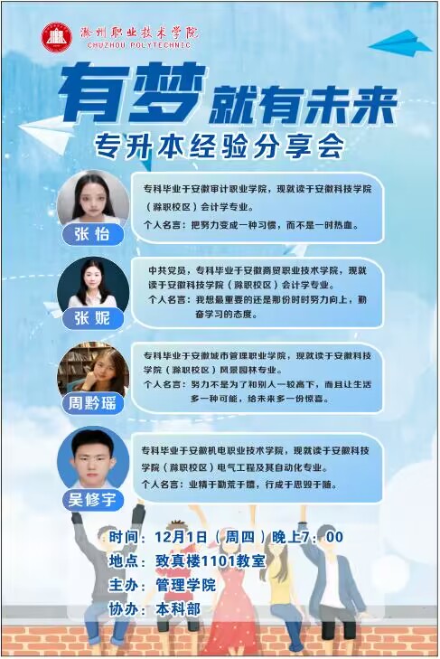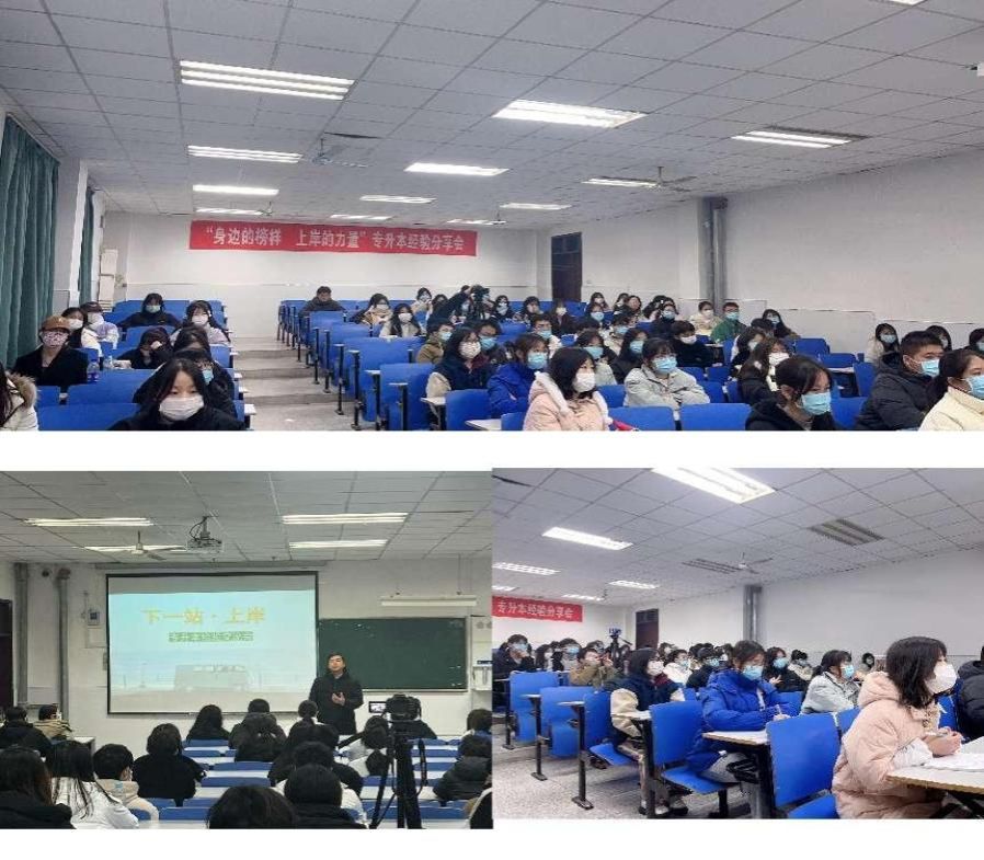 为推进优良学风建设,增强管理学院学生对专升本考试的认识,做好未来的学习规划,我院于12月1日成功举办了以“身边的榜样,上岸的力量”为主题的专升本经验分享会。本科部4名优秀的学长、学姐吴修宇、张怡、张妮、周黔瑶给来自不同年级的50名学生分享了升本经验。分享会由辅导员汪亚运主持。