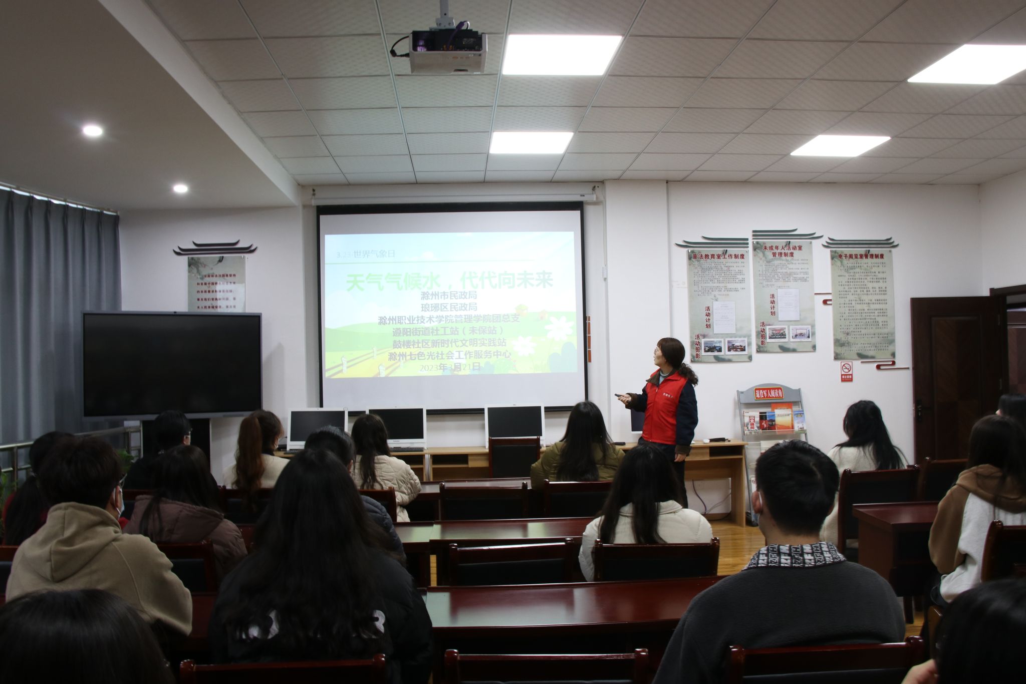 每年的3月23日是世界气象日,为了进一步普及气象知识,扩大宣传气候环境保护理念。管理学院团总支于2023年3月21日在琅琊区鼓楼社区举办“ 世界气象日”主题座谈会。本次座谈会由管理学院团总支书记袁一老师主持,管理学院团总支成员积极参加。