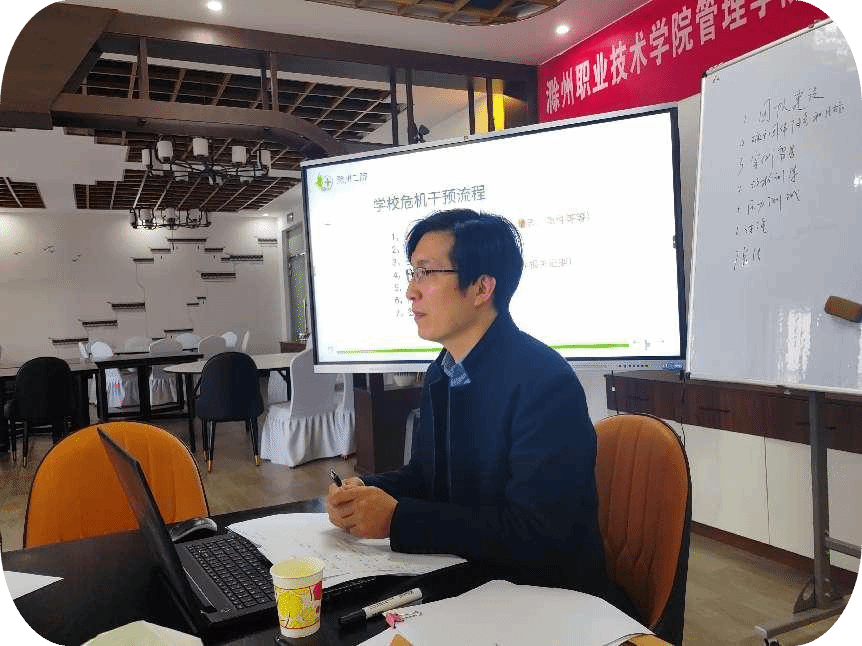 此次沙龙活动包含两大环节:一是学生心理个案研讨;二是辅导员心理压力调节。在学生心理个案研讨环节,王主任采用结构化模式组织大家依次进行案例介绍、提问、回答、讨论、总结和反馈,并分析学校危机干预中的法理情,总结学校危机干预流程,让大家对学生心理工作有了更深的认识。在辅导员心理压力调节环节,王主任组织大家进行心理压力测试和心理调适,并邀请了压力过高者、过低者分享自己的工作状态和生活状态,引导辅导员认识自己的人格特质、找到适合自己的情绪宣泄方法。