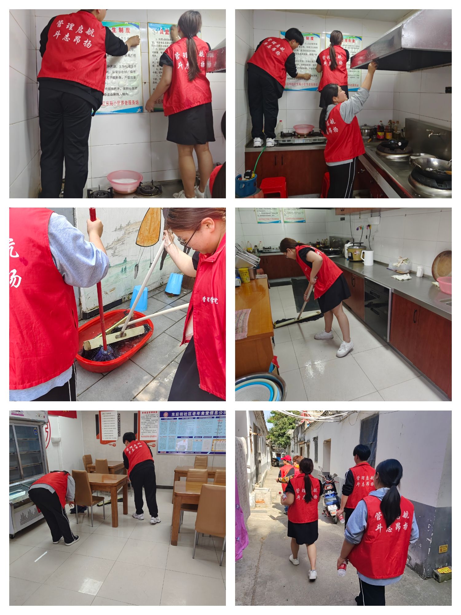 4月30日,由管理学院志愿者们对东后街养老服务站进行了大扫除活动。每个成员分别展开工作,先是在厨房将满是油渍的墙面进行洗刷,泛黄的墙面变得白了,随后用拖把将厨房和食堂打扫干净,大家不怕苦不怕累,对垃圾和杂物进行了彻底清理,不留卫生死角,不草率应付。打扫干净之后,大家又前往社区居民的家里,看望老人,对房间进行整理、清扫,将各个物品摆放整齐,将地面打扫干净,将门口的植物进行浇水养护。
