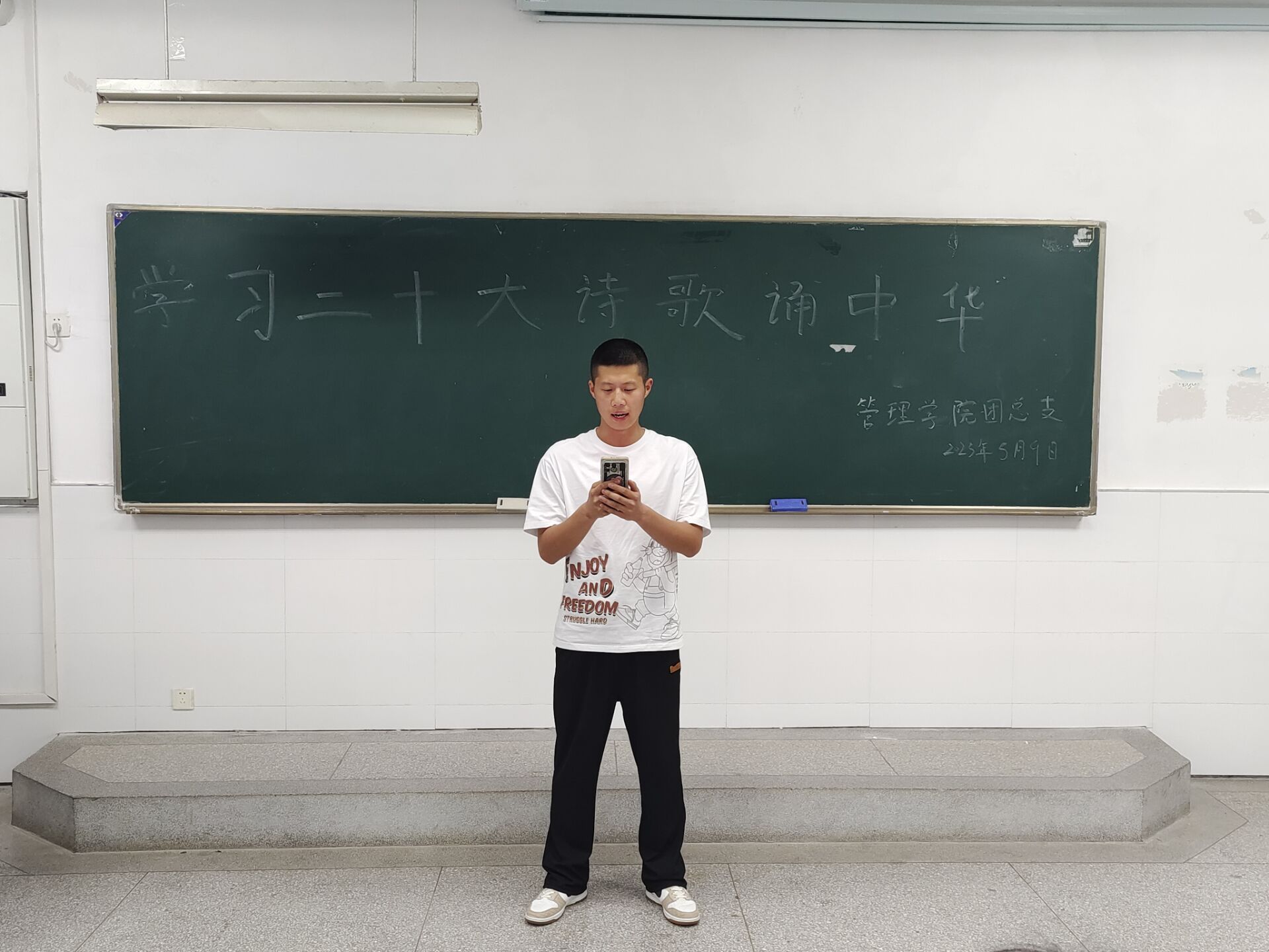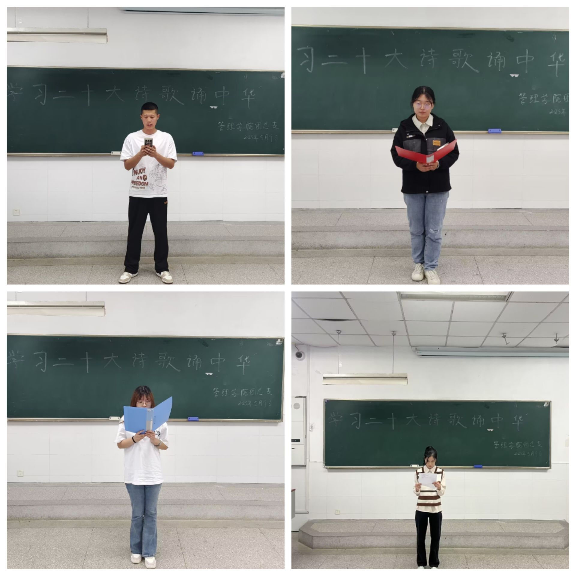 为深入学习党的二十大精神,加强管院学子爱国主义教育。管理学院团总支于2023年5月9日中午12:30在1102教室开展“学习二十大 诗歌颂中华”主题朗诵比赛,本次活动由外联部洪扬负责,管理学院22级同学积极参加。