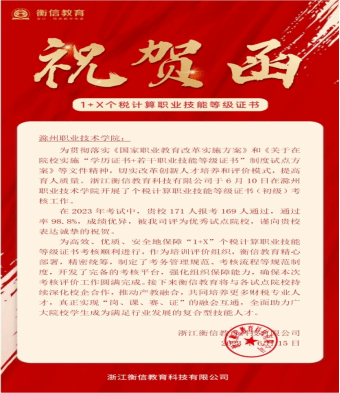 6月14日,管理学院收到“1+X”个税计算职业技能等级证书评价组织——浙江衡信教育科技有限公司发来的祝贺函,祝贺金沙威尼斯官网首次“1+X”个税计算职业技能等级证书考试成绩优异,金沙威尼斯官网被评为“优秀试点院校”。