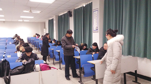 2016年1月12日上午10点,吴大明副院长在经贸系主任翁嘉晨、书记陈开兵、副主任宋君远、督导室葛桂云老师的陪同下,一起深入经贸系期末考试考场进行了巡查。