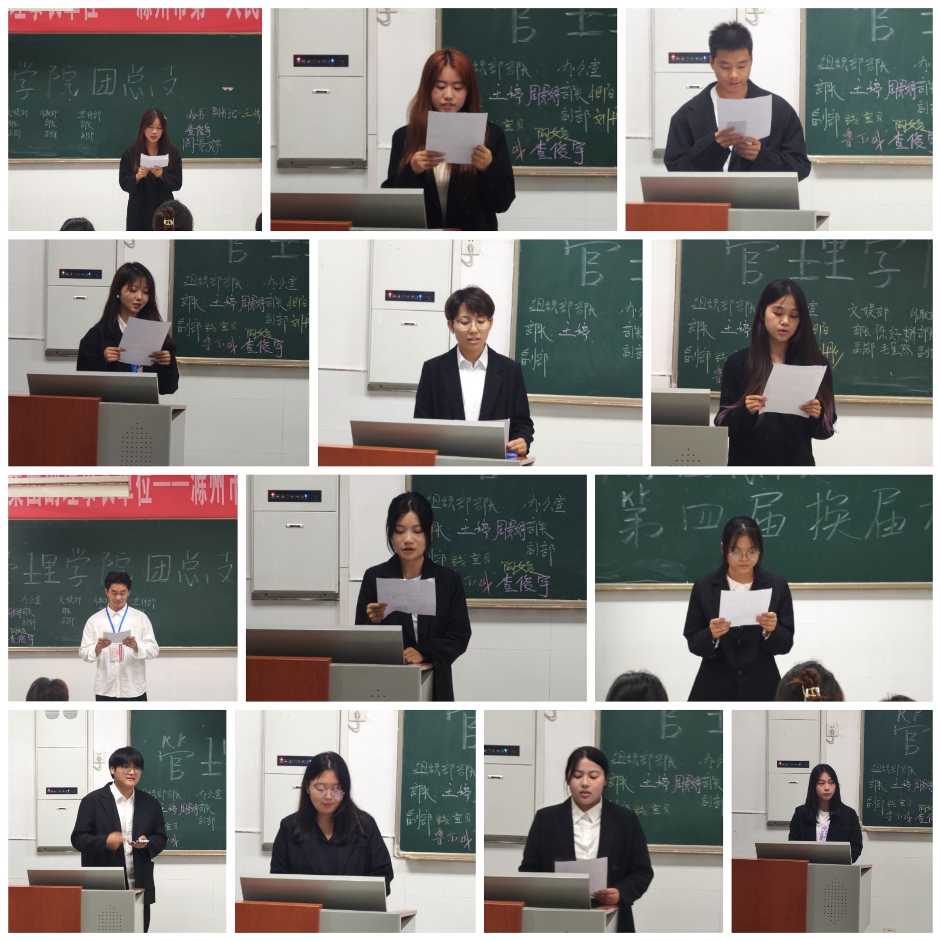 会议伊始,由主持人宣读新一届团总支任职名单并且向新成员们表示欢迎。会议中,新一届团总支副书记王婷同学代表团总支成员发言,她表示,要站在新的起点上,积极投身于学院的建设中,争做一名“有理想,敢担当,能吃苦,肯奋斗”的新时代青年。