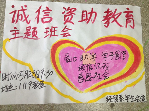 在2012级营销班级带头下,经贸系团总支学生会将对更多的班级进行资助诚信主题进行班级宣传。通过开展学生资助诚信教育主题活动,增强大学生的诚信意识,促进国家助学贷款工作的顺利开展,进一步提高大学生的综合素质,强化资助工作的育人效果,增强学生诚信意识,构建以诚信为荣的校园文化氛围。