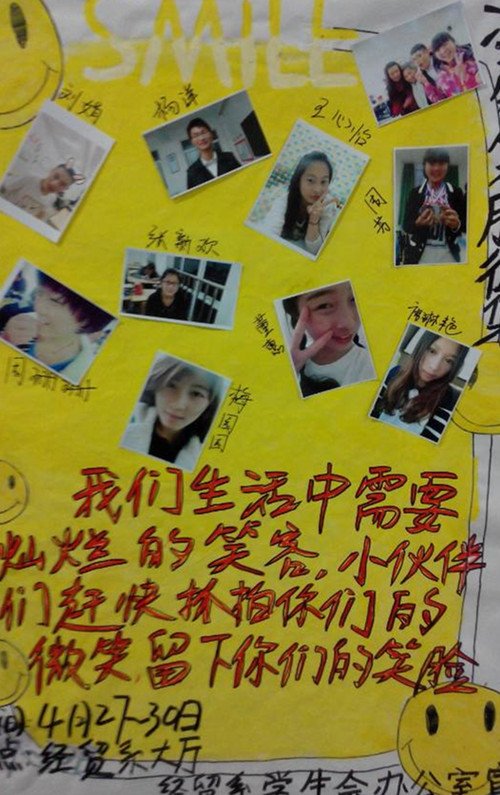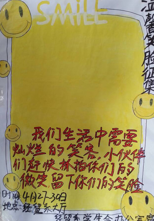 为进一步丰富校园文化生活,不断提升同学们在生活中寻找美、发现美的能力,帮助同学们感悟生活真谛,绽放青春的笑容,2014年4月28日中午,经济贸易系团总支、学生会在经贸系大厅开展“温馨笑脸”征集活动。