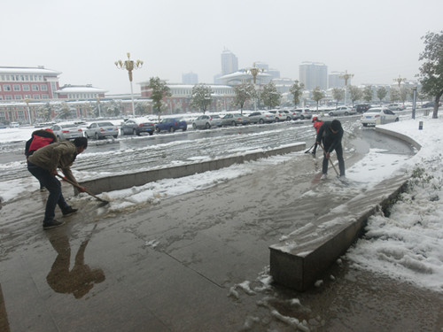 期间,经贸系团总支、学生会志愿者们齐心协力一同顶着风雪奋战,大家扫的扫,铲的铲,短短一个多小时,一条条洁净无雪的便道就呈现出来。