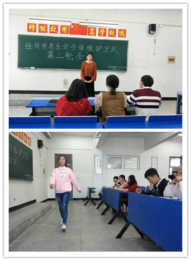 为促进国旗护卫队工作更加规范,10月20日中午,经济贸易系国旗护卫队第二轮招新面试活动在1101教室展开。本次纳新面试由经贸系学生会安保部成员组织开展,此次国旗护卫队二轮面试的主考官有经济贸易系学生会安保部孙明涛、学生会文娱部代迪、国旗护卫队队长陆铖。