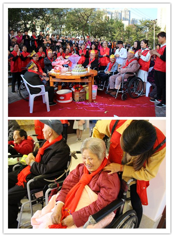 志愿者们来到了乐康老年护理中心,在负责人的组织下有序的开展志愿服务活动。志愿者们主动给老人们揉背捶腿,帮他们打扫卫生。活动中志愿者为老人们过生日,老人们的欢声笑语充满了整个老年护理中心,使原本冷清的护理中心增添了温心的色彩。活动最后,志愿者们和其他院校成员为老人们献上了准备好的节目,大家一起演唱相亲相爱一家人。当看到老人们灿烂的笑容,听到老人们爽朗的笑声,志愿者们充分体会到了本次活动的意义所在——弘扬民族传统,关爱老年群体。