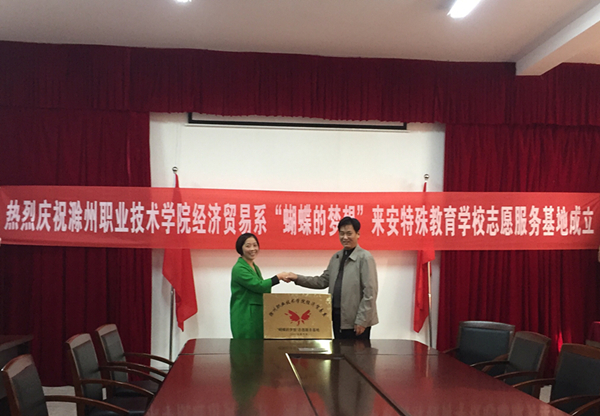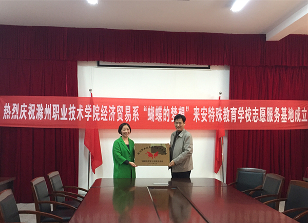 为了关爱特殊儿童群体,弘扬志愿服务精神,10月25日下午,经贸系“蝴蝶的梦想”志愿服务基地成立仪式在来安特殊教育学校举行,来安特殊教育学校校长李永乐、经济贸易系团总支书记何文婧及部分志愿者和老师参加了此次仪式。