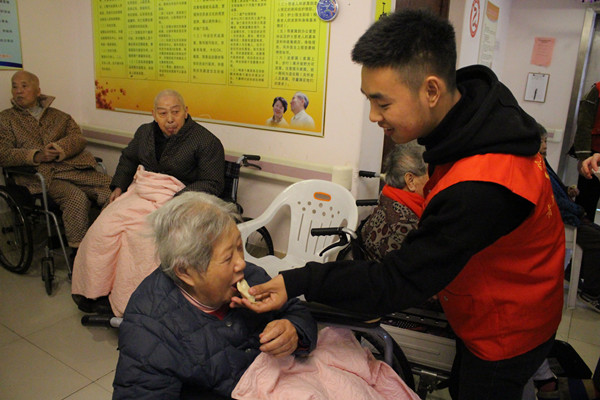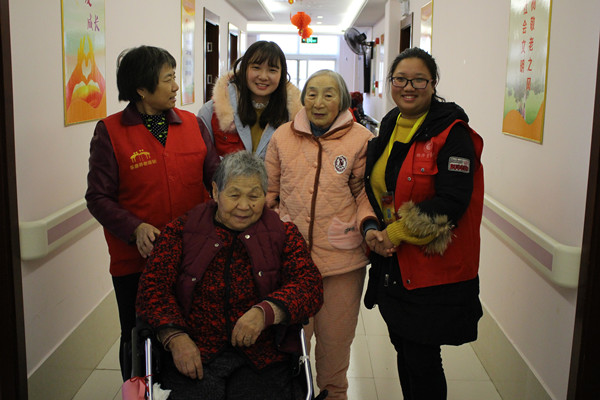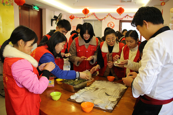 到达“乐康老年护理中心”后同学们分为若干个小组,各有分工。有的到各个楼层的客厅陪老人拉拉家常,讲讲笑话;有的扶着老人到走廊外面散散步,晒晒太阳;同时部分同学进行包饺子活动,包饺子时有些老人也参与到包饺子的活动当中来,同学们一边包着饺子一边表演节目,老人脸上都洋溢着幸福的笑容。饺子煮好之后,同学们把热腾腾的饺子送到老人面前,让他们感受到我们的对他们的爱,让这个冬天不再那么寒冷。