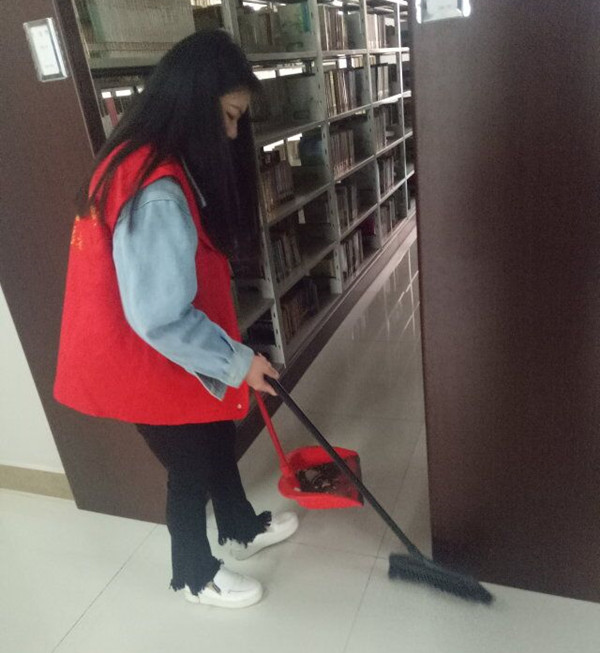志愿者自带抹布、盆、扫帚、簸箕、拖把等工具按时来到图书馆一、二、三层楼进行卫生打扫。活动一开始,志愿者们分工明确,书橱的各个角落无一遗漏,地面被打扫的一尘不染。在服务活动过程中,志愿者们始终保持安静,自觉维护图书馆良好读书氛围,有条不紊地整理书籍,并把书本按类别归类。