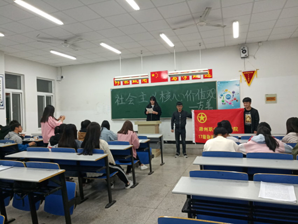 团课开头,各班团课人就各班主题对其作出详细的解说,深刻阐述了社会主义核心价值观中国家层面的“富强”、“文明”、“和谐”,社会层面的“自由”、“平等”,个人层面的“爱国”“敬业”“诚信”的思想含义。团课讲述过程中,班级团员联系实际生活踊跃发表自身看法,将原来的“高大上”内容化深刻为生动,把小想法说出了大道理。其中各班团课都重点讲述了作为新时代的大学生,我们应当如何去践行社会主义核心价值观,这系列的观点引起同学们的热烈讨论,同学门都各抒己见,场面精彩纷呈。