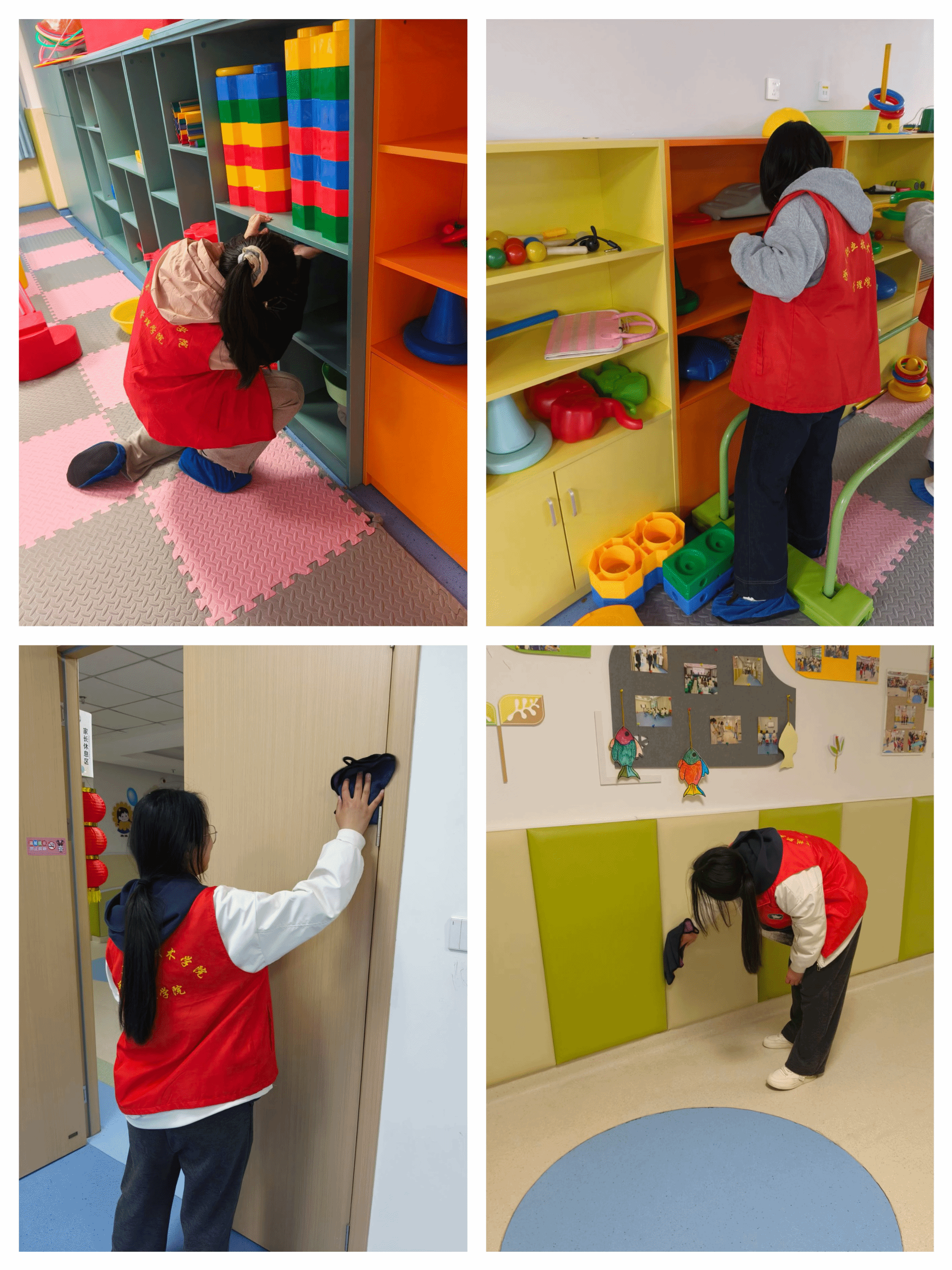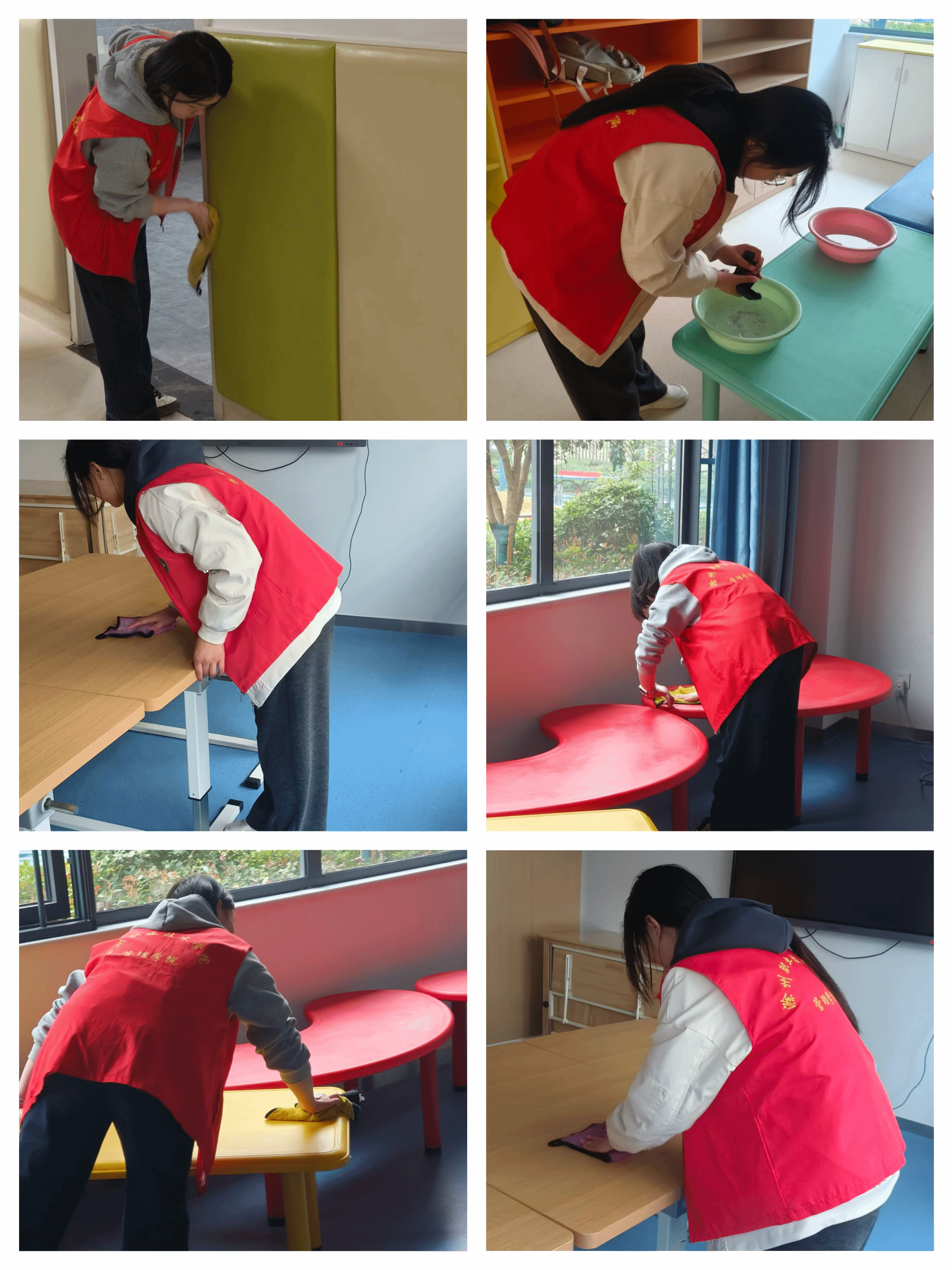 活动开始,志愿服务队便投入到紧张的环境清洁工作中。志愿者们手持扫帚、抹布等工具,对医院儿童康复训练室、走廊、户外区域进行清扫,用实际行动为小朋友们打造了一个干净整洁、舒适温馨的康复环境。随后,志愿者们与孩子们展开亲切的互动陪伴。在训练室,志愿者手持彩笔,耐心引导孩子们用色彩表达情绪,用画笔描绘心中的梦想。一幅幅充满童趣的画作,不仅展现了孩子们丰富的内心世界,也拉近了他们与志愿者之间的距离。