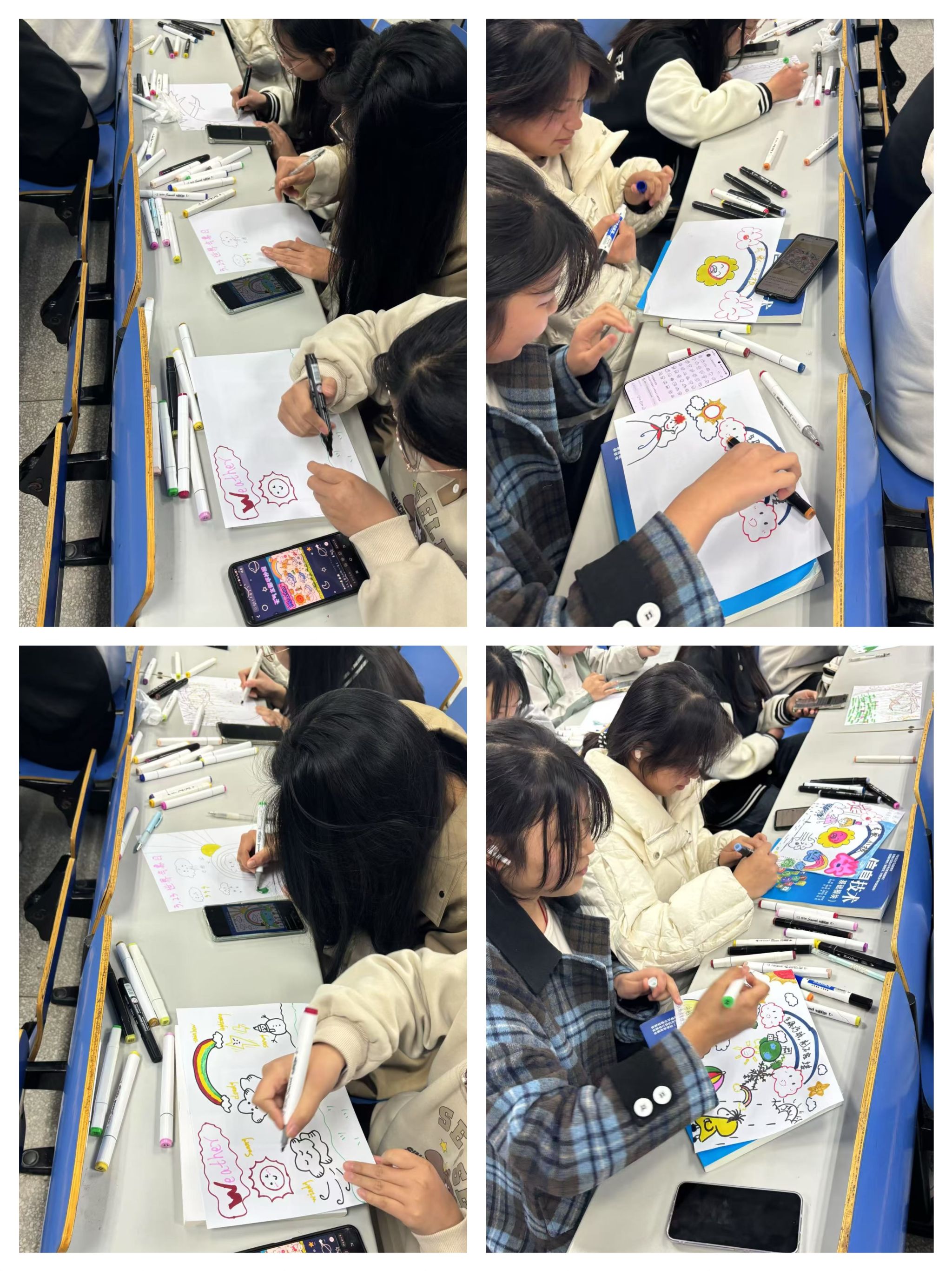 活动期间,同学们满怀热情,认真投入。大家用手中的画笔,将对气象的理解与想象在画纸上尽情挥洒。一幅幅绘画作品五颜六色,神采不一。有的描绘风雨交加的震撼场景,有的展现晴空万里的祥和画面,还有的呈现极端气候下的警示画面,生动展现气象的多样与魅力。在创作过程中,同学们深入了解不同气象知识,既普及了气象知识,又深化对气候变化的思考,增强了对各种气象的兴趣。
