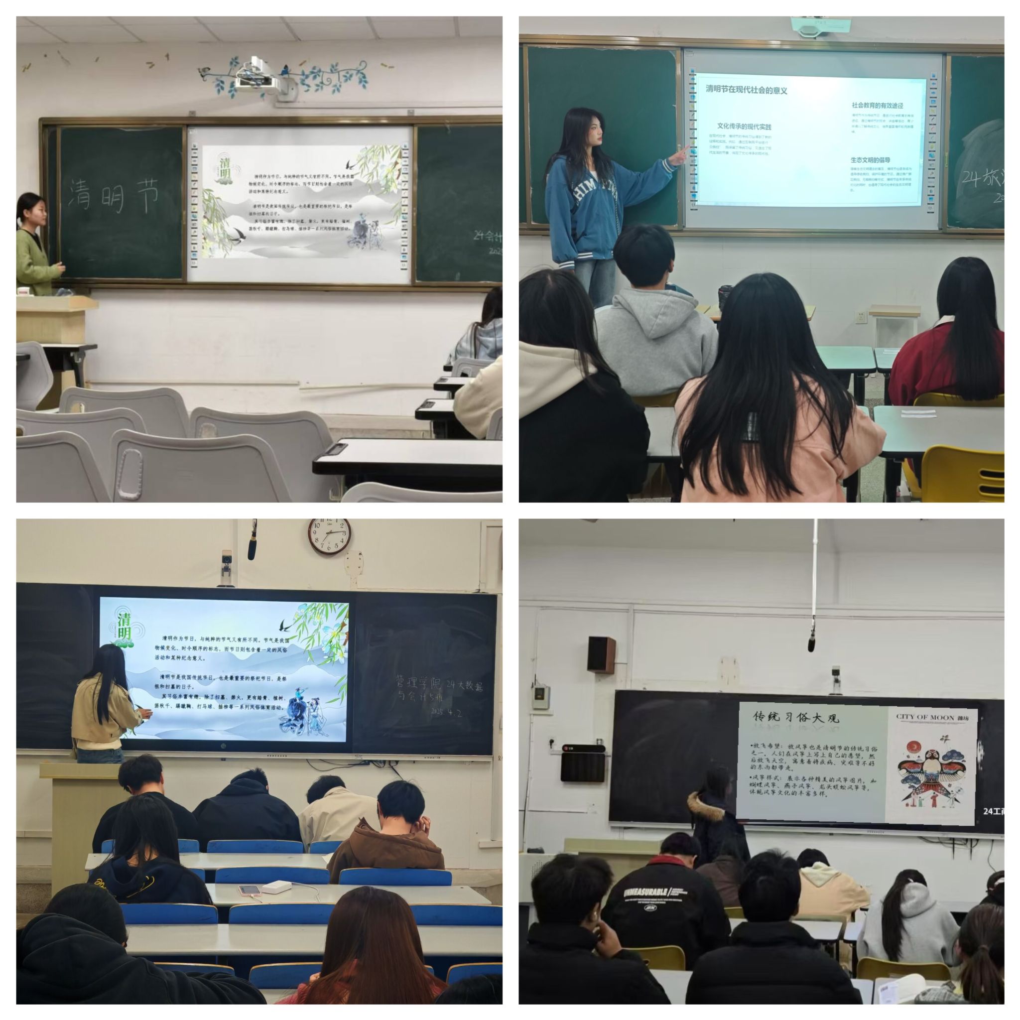 活动开始,各位学生代表从清明节的起源讲起,结合历史典故与古籍记载,阐述了清明节从最初的节气,到融合寒食、上巳等节日习俗,逐渐形成如今兼具祭祀与踏青等丰富内涵的演变过程。同学们认真聆听,对清明节的历史渊源有了清晰认知,深刻感受到中华文化的源远流长。在讲解清明习俗环节,通过一幅幅生动的图片,将扫墓祭祖、踏青、插柳、放风筝等传统活动直观地呈现在同学们眼前。每一张图片都仿佛在诉说着一个古老的故事,同学们被深深吸引。活动尾声,数位同学上台分享家乡清明习俗。从南方祭祀仪式到北方青团制作,同学们探讨交流,升华对传统文化的感悟。