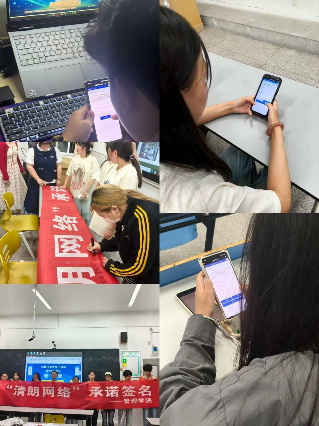管理学院组织三个年级的学生参与全国大学生网络安全知识竞答活动,题目涵盖网络诈骗防范、个人信息保护、网络安全法规等多个维度。同学们通过手机端积极答题,在竞答中深入掌握网络安全知识,同时在“清朗网络”横幅上签名,以实际行动践行网络文明,共同维护清朗网络空间。