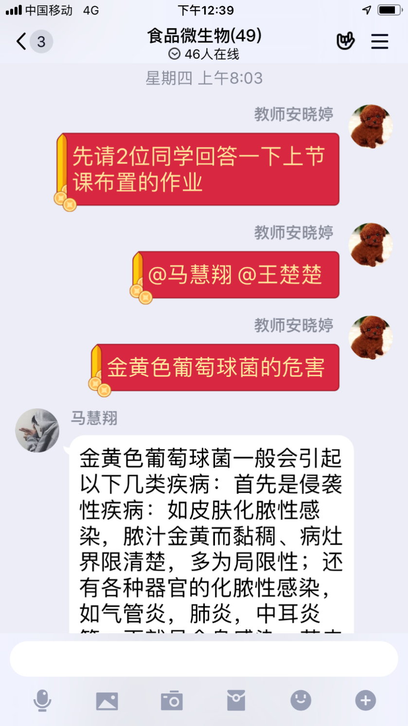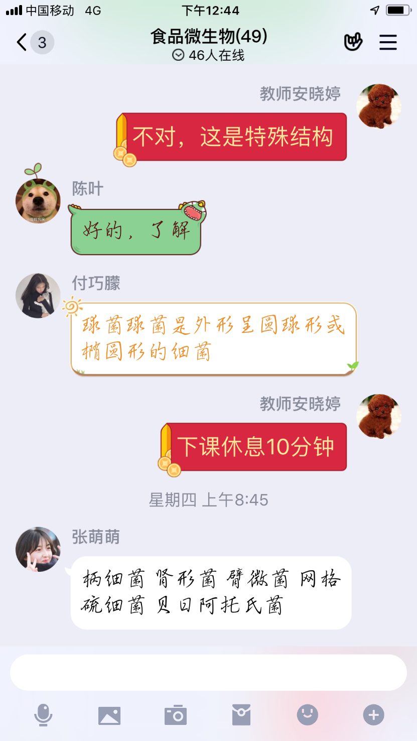 我会让同学们打开我在群里发的ppt,用语音讲解本节课学习的主要内容,接着带着大家看中国大学慕课上已选好的精品课程,看完一个知识点大概10分钟,我会在群里提问,很多同学都积极回答,我还会提一些引申的问题,让同学们自己查找资料(比如讲微生物发展历史,我会让同学们查找青霉素的发现过程),我会在群里给大家回复,进行大概10分钟的交流讨论,接着我还会让大家打开ppt,我用语音或者腾讯会议直播继续讲解这个知识点,加深同学们的理解,达到巩固的效果。