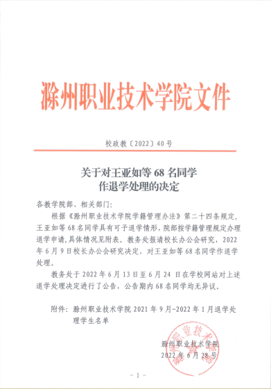 关于对王亚如等68名同学作退学处理的决定 校政教〔2022〕40号