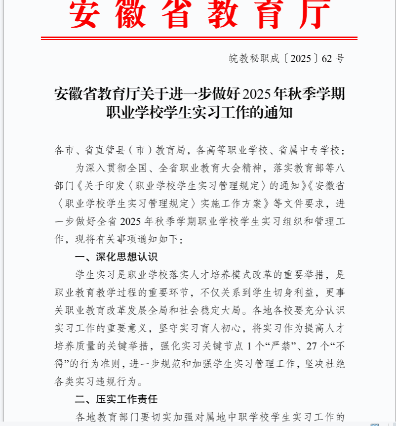 关于进一步做好2025年秋季学期职业学校学生实习工作的通知