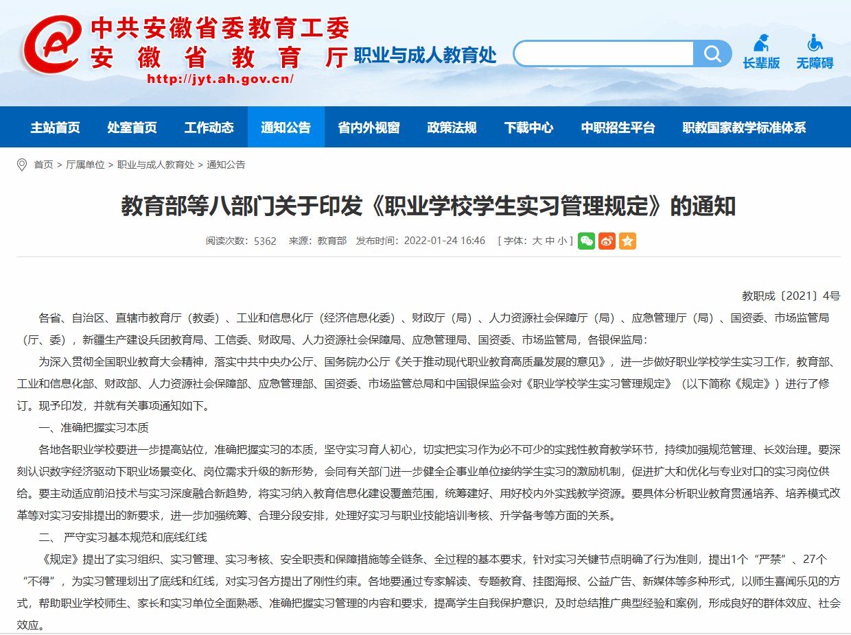 教育部等八部门关于印发《职业学校学生实习管理规定》的通知