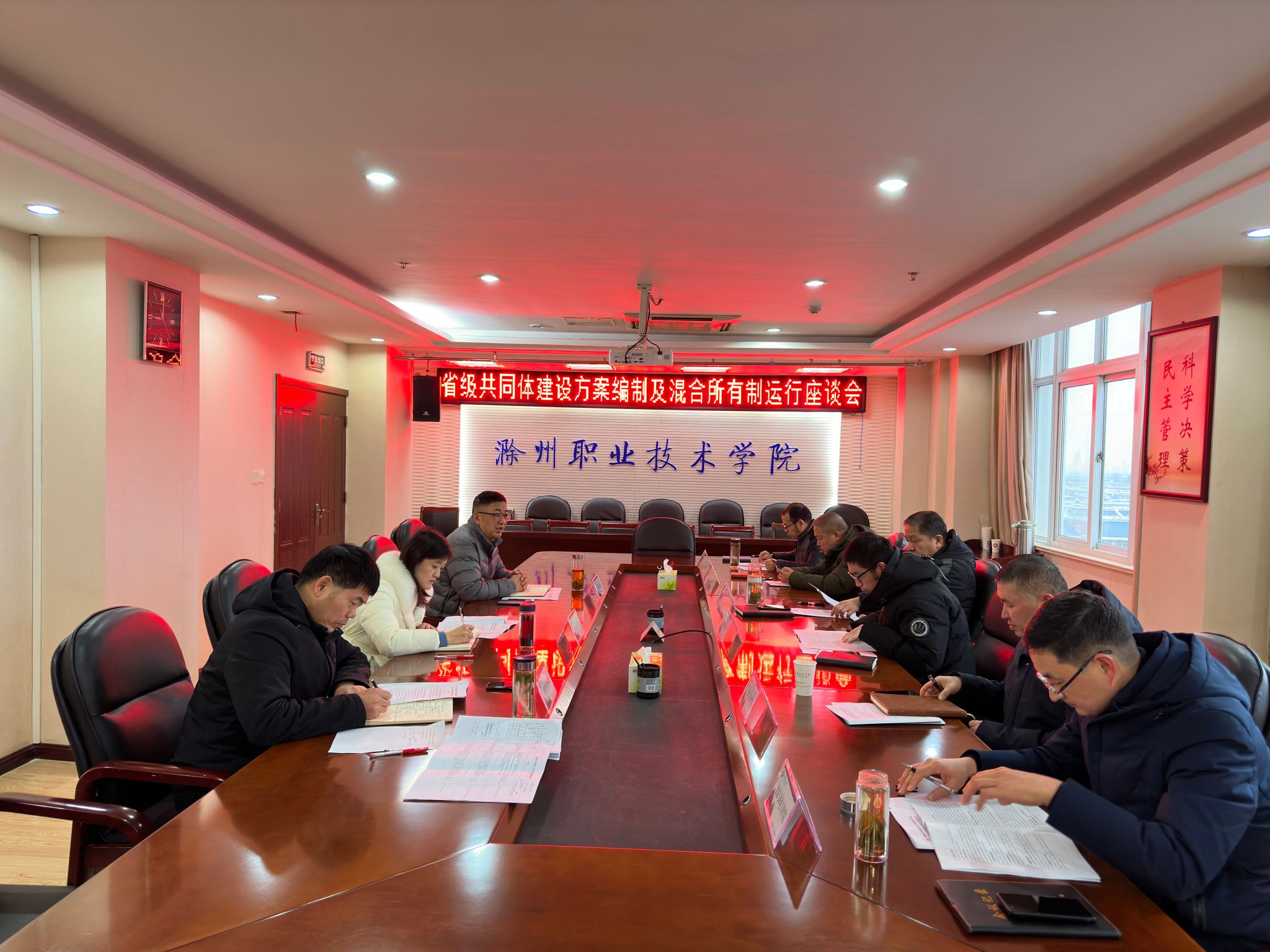 1月8日上午,学校在综合楼804会议室召开省级产教融合共同体建设方案编制工作暨合作项目混合所有制运作座谈会,校党委委员、组织人事处处长王宇,校长助理、招生就业处处长、滁州职教集团秘书长穆松出席会议,组织人事处、教务处、招生就业处、科技处、电气工程学院、机械与汽车工程学院、食品与环境工程学院等部门主要负责同志参加。