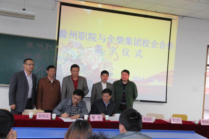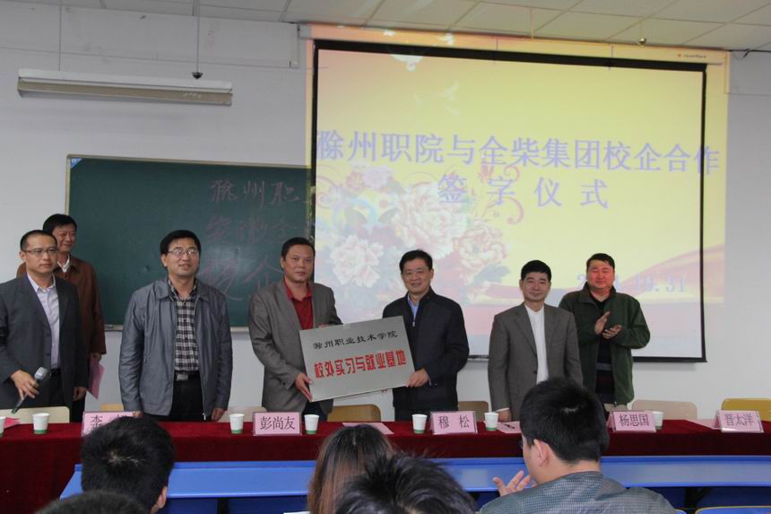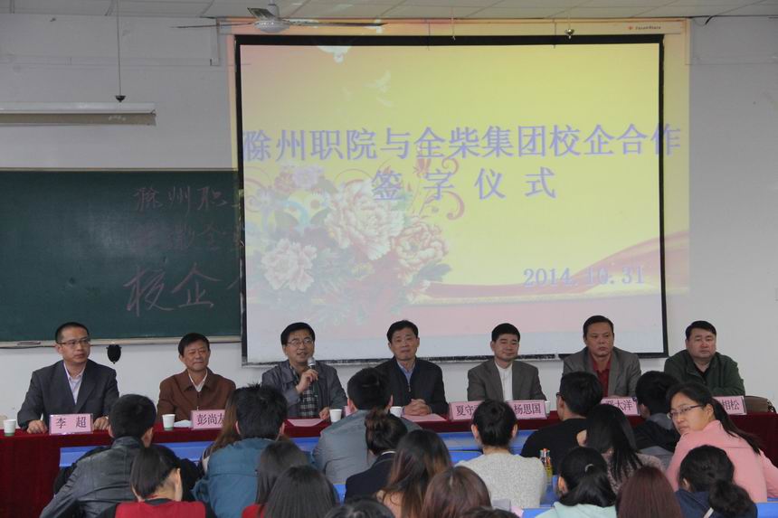 2014年10月31日下午在北阶204多媒体教室,金沙威尼斯欢乐娱人城与安徽全柴动力股份有限公司签立了校企合作协议并进行了“就业实习基地”授牌仪式。全柴动力股份有限公司人力资源总监夏守武,人力资源部经理郑启斌,人力资源部副经理彭尚友,金沙威尼斯欢乐娱人城院长助理、招生就业处处长穆松,招生就业处副处长李超,机电工程系系主任杨思国,机电工程系系党总支书记晋太洋,机电工程系副主任燕相松参加了会议。