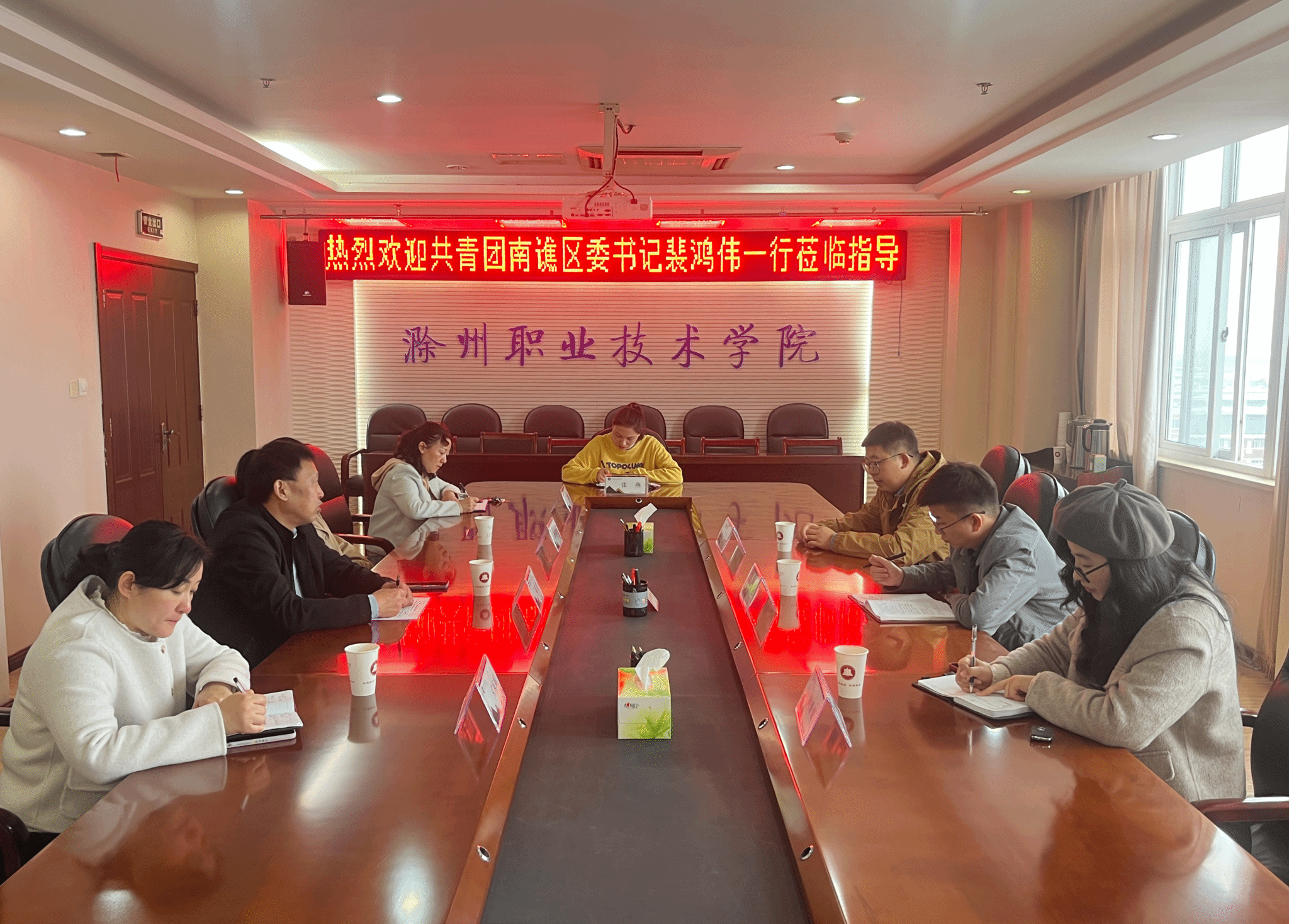 为共享思政实践教育基地资源,善用社会大课堂,2023年11月9日,共青团南谯区委书记裴鸿伟、滁州旅游商贸学校团委书记梁励康、滁州敬梓中学团委书记阚媛媛一行来我院洽谈思政阵地校地合作,马克思主义学院院长孔金、副院长张家莉及相关老师陪同参观并参加调研会议。