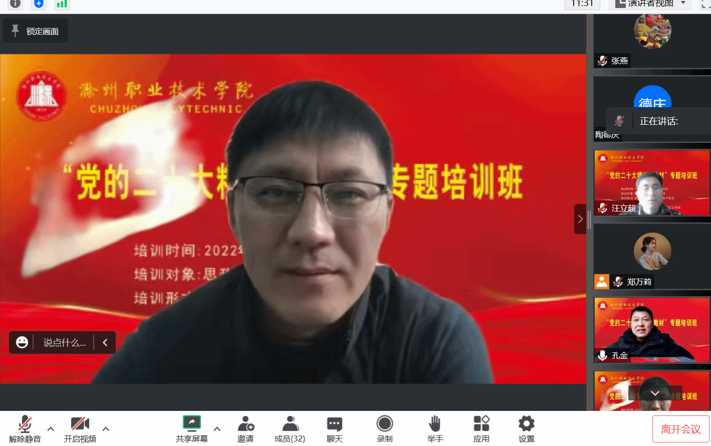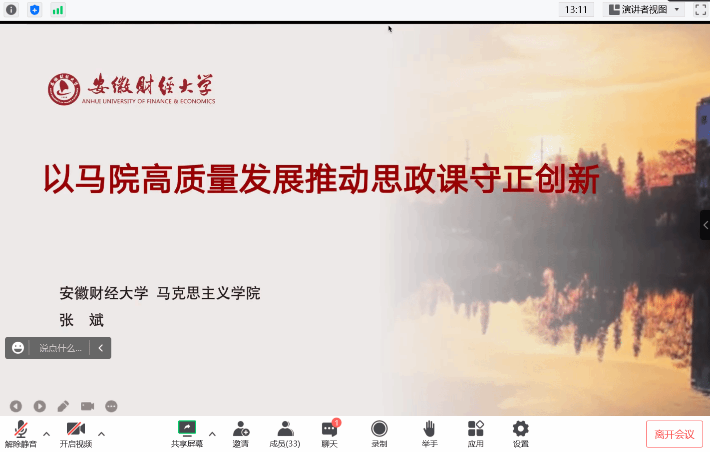 金沙威尼斯欢乐娱人城习近平新时代中国特色社会主义思想和党的二十大精神进教材专题培训班正在有序的进行中,12月27日,安徽财经大学马克思主义学院院长、教授张斌受邀做第三场专题辅导《以马院高质量发展推动思政课守正创新》,线上会议由马克思主义学院副院长孔金主持,全体专兼职思政教师参加。