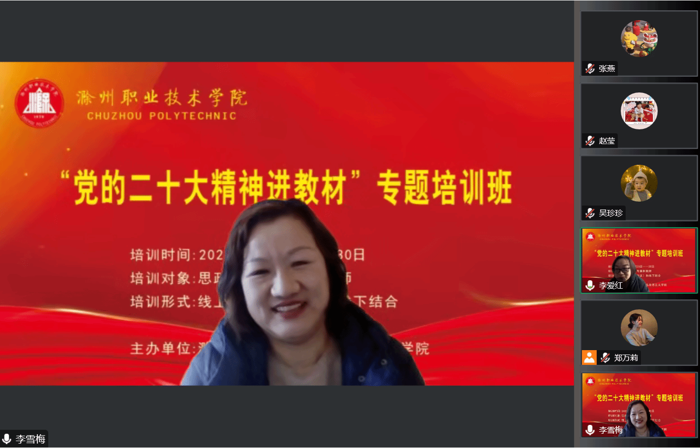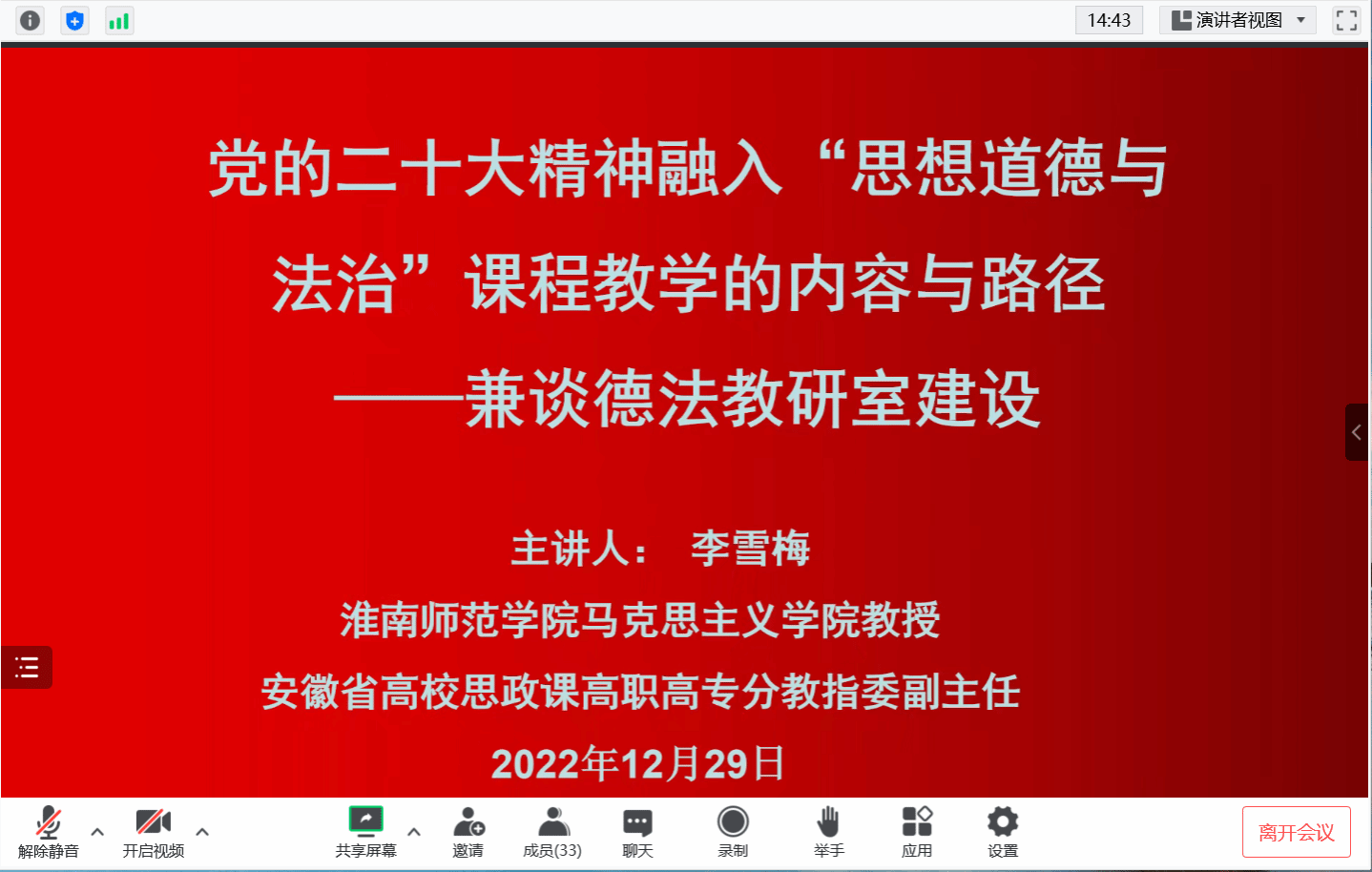 金沙威尼斯欢乐娱人城习近平新时代中国特色社会主义思想和党的二十大精神进教材专题培训正在有条不紊的进行中,12月29日上午,淮南师范学院马克思主义学院教授李雪梅受邀做第五场专题辅导《党的二十大精神融入“思想道德与法治”课程教学的内容与路径》,线上会议由马克思主义学院院长李爱红主持,全体专兼职思政教师参加。