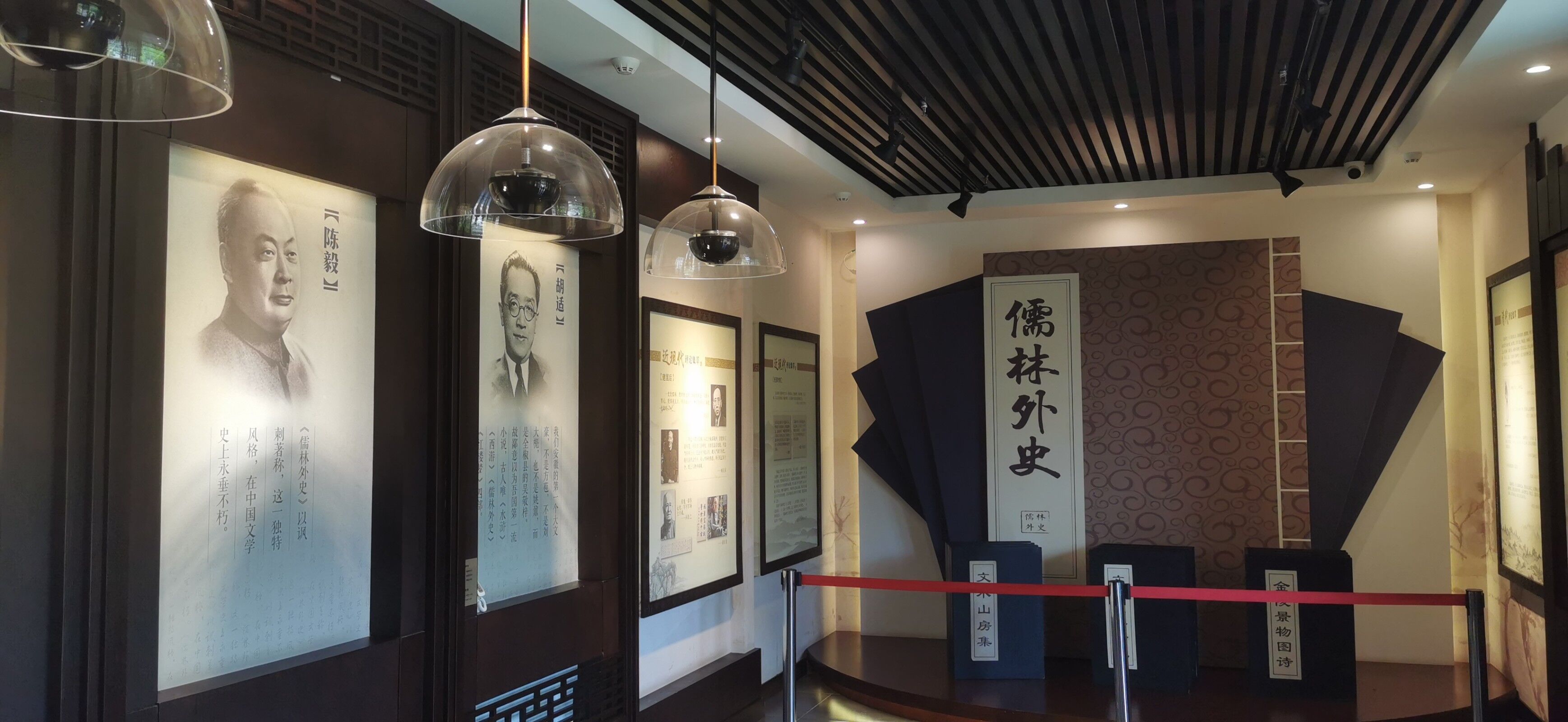 吴敬梓纪念馆内建筑仿明清风格,雕梁画栋,曲槛回廊,典雅幽静,馆内树秀竹翠,花开四季。整个馆园既有南方园林之秀,又有北方古建之雄。走进敞亮的过厅,两边有一幅楹联:“儒林轶事施罗笔;史册外篇迁固文。”笔健字奇,令人瞩目;正中矗立着高大石碑一座,正面镌刻鲁讯先生评吴敬梓《儒林外史》手迹,文曰:“迨吴敬梓《儒林外史》出,乃秉持公心,指摘时弊,机锋所向,尤在士林;其文又感而能谐,婉而多讽;于是说部中乃始有足称讽刺之书。”,碑的背面,刻的是吴敬梓生平传略。