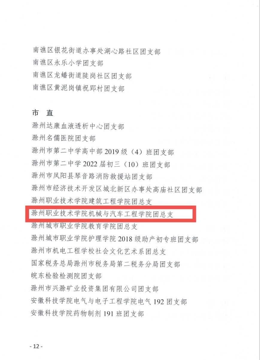 滁州市五四红旗团(总)支部是共青团滁州市委授予全市基层团组织的最高荣誉。近年来,机械与汽车工程学院团总支在校团委和院党总支的正确领导下,紧密围绕学校、学院工作实际,认真贯彻落实各项工作部署,充分发挥团组织凝聚青年团员力量的先进政治作用,扎实推进我院广大团员青年的思想建设,引领广大团员青年健康成长成才,推动学院团学工作实现新的发展。