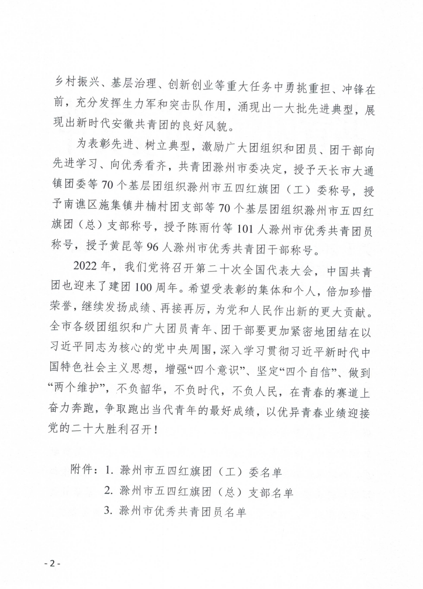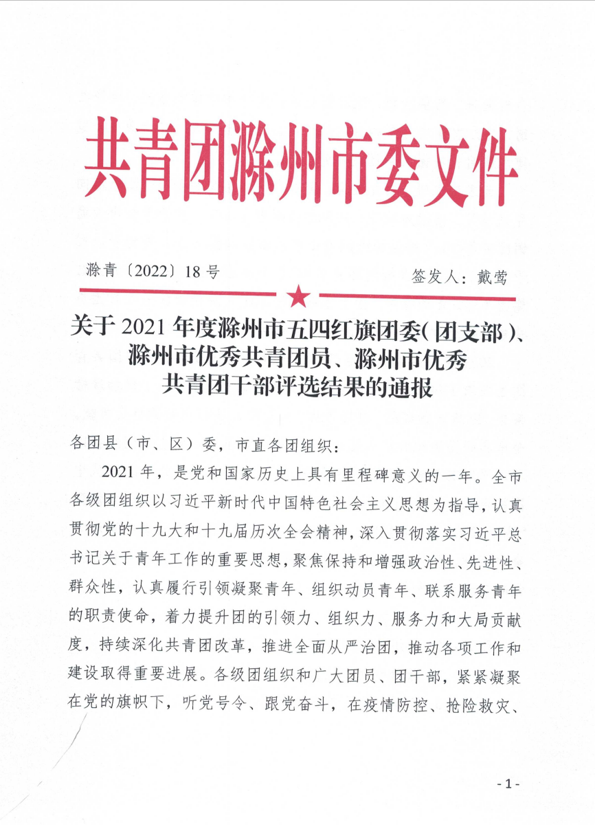 近日,团市委发布《关于2021年度滁州市五四红旗团委(团支部)、 滁州市优秀共青团员、滁州市优秀共青团干部评选结果的通报》,我院团总支荣获“滁州市五四红旗团(总)支部”荣誉称号。