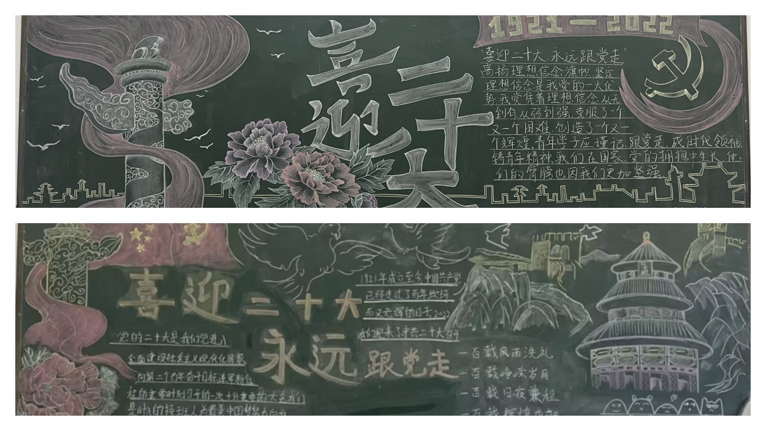 各班级积极响应、有序组织。同学们积极参与、精心选材、明确分工,充分发挥自己的聪明才智,把对党的热爱和祝福融入文字和图画中。班级同学为创作一幅美观大方的黑板报献计献策,各班板报内容丰富、版式多样、布局美观。一幅幅图文并茂、创意新颖的黑板报成了校园一道靓丽的风景线。