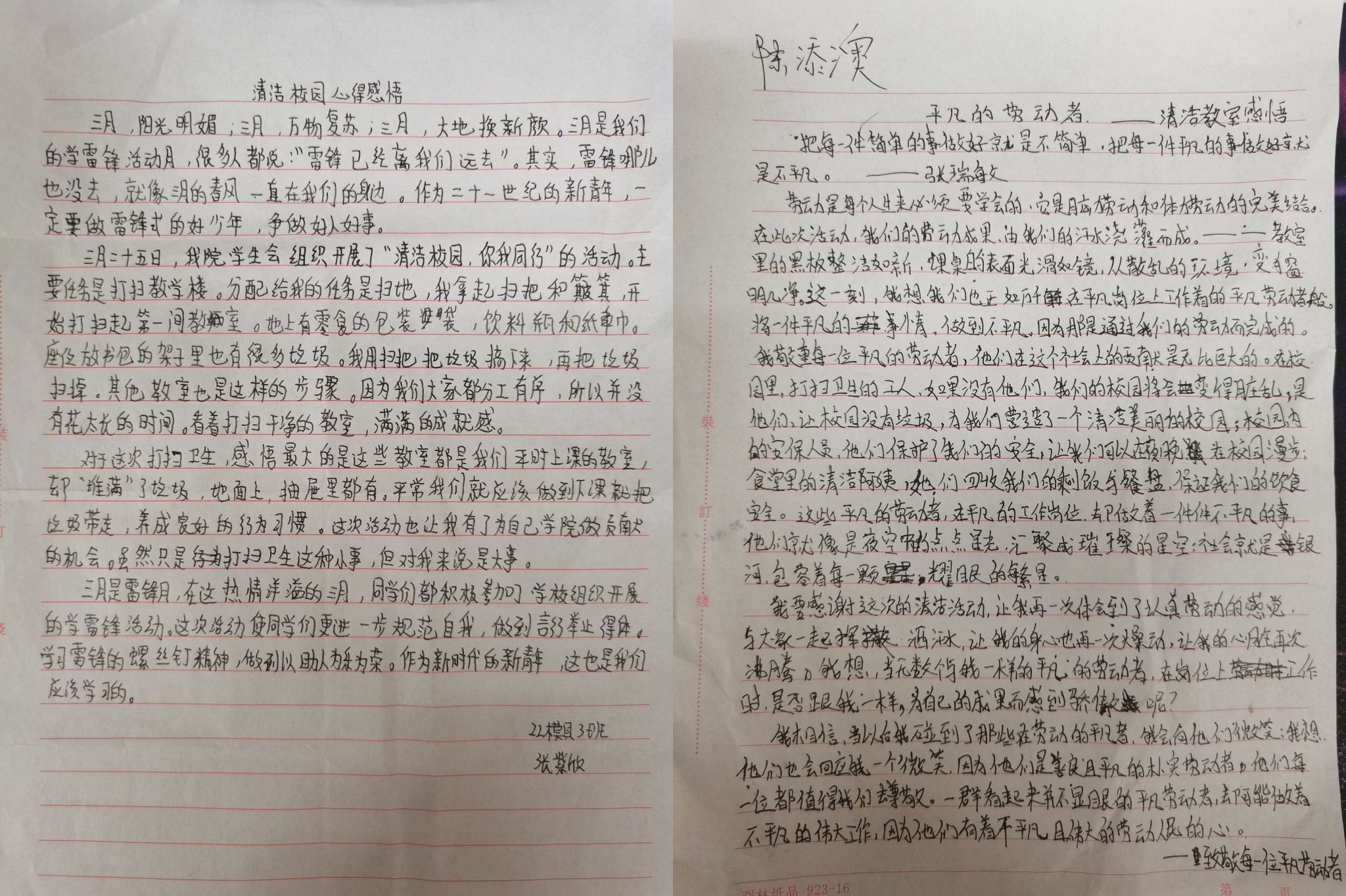 其中,陈添澳同学写道:“我坚信,劳动是世界上一切欢乐和一切美好事情的源泉!雷锋同志曾说过:‘力量从团结来,智慧从劳动中来,行动从思想来,荣誉从集体来。’雷锋的精神犹如一盏明灯,激励着一代又一代的青年勇往直前。”