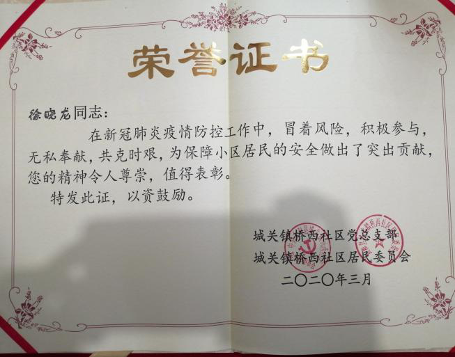 机械与汽车工程学院19汽检2班同学徐晓龙,疫情发生后牢记自己的团员身份。积极响应团的号召,就近到社区参加疫情防控工作。配合社区工作人员对居民进行出入登记、测量体温。
