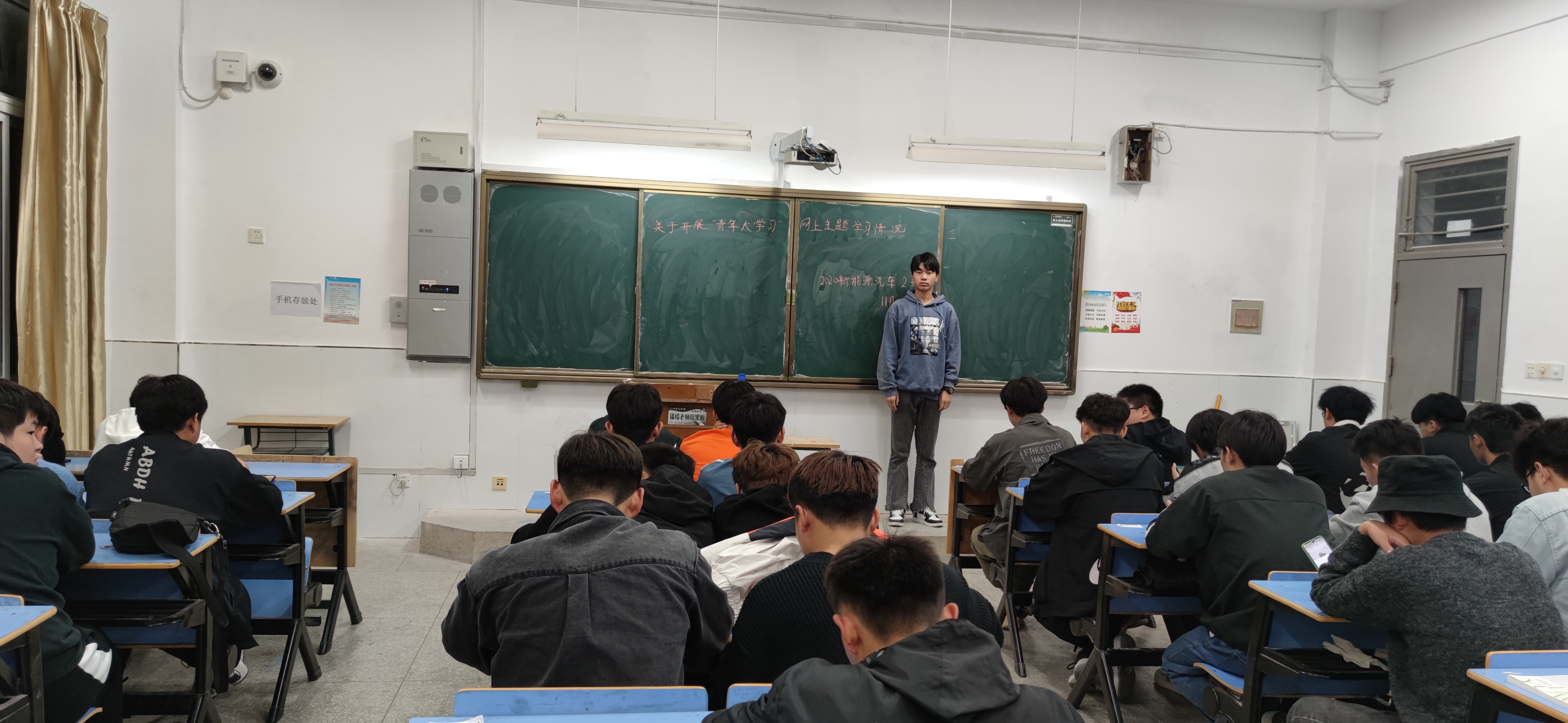 2020年11月12日晚19点,金沙威尼斯欢乐娱人城机械与汽车工程学院2020级新能源2班在5313教室开展了青年大学习网上主题团课学习情况反馈班会,全体同学参加。