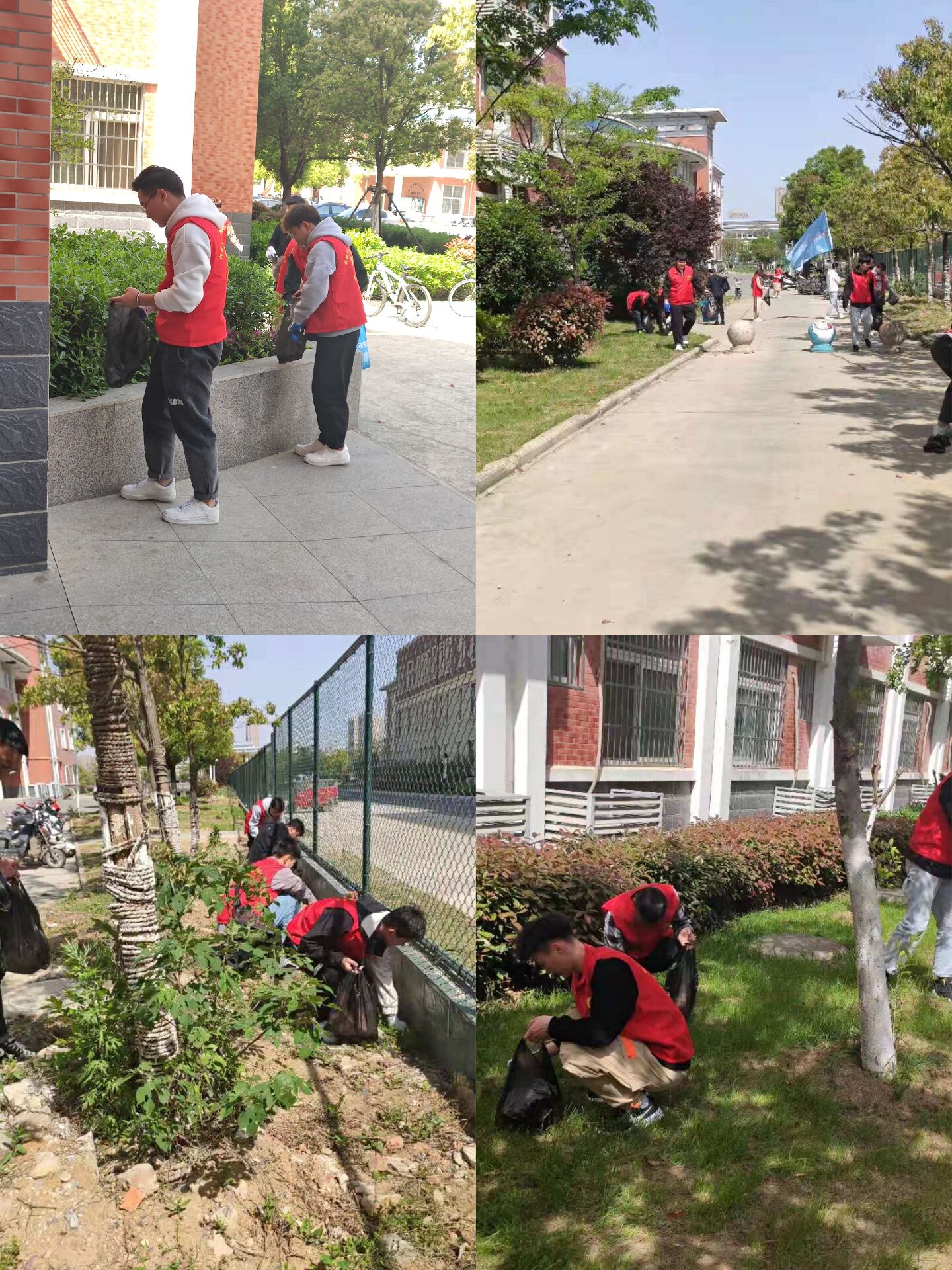 活动伊始,33名青年志愿者们身穿鲜红的志愿者马甲,手戴白手套,提着垃圾袋,分成两组,在宿管阿姨和系学生会卢宇航、梁瀚允干事的带领下,分别对9号至12号学生公寓楼周边进行了细致的清扫整理,短短一个小时就将周边的纸屑、烟头打扫的干干净净,收获满满。