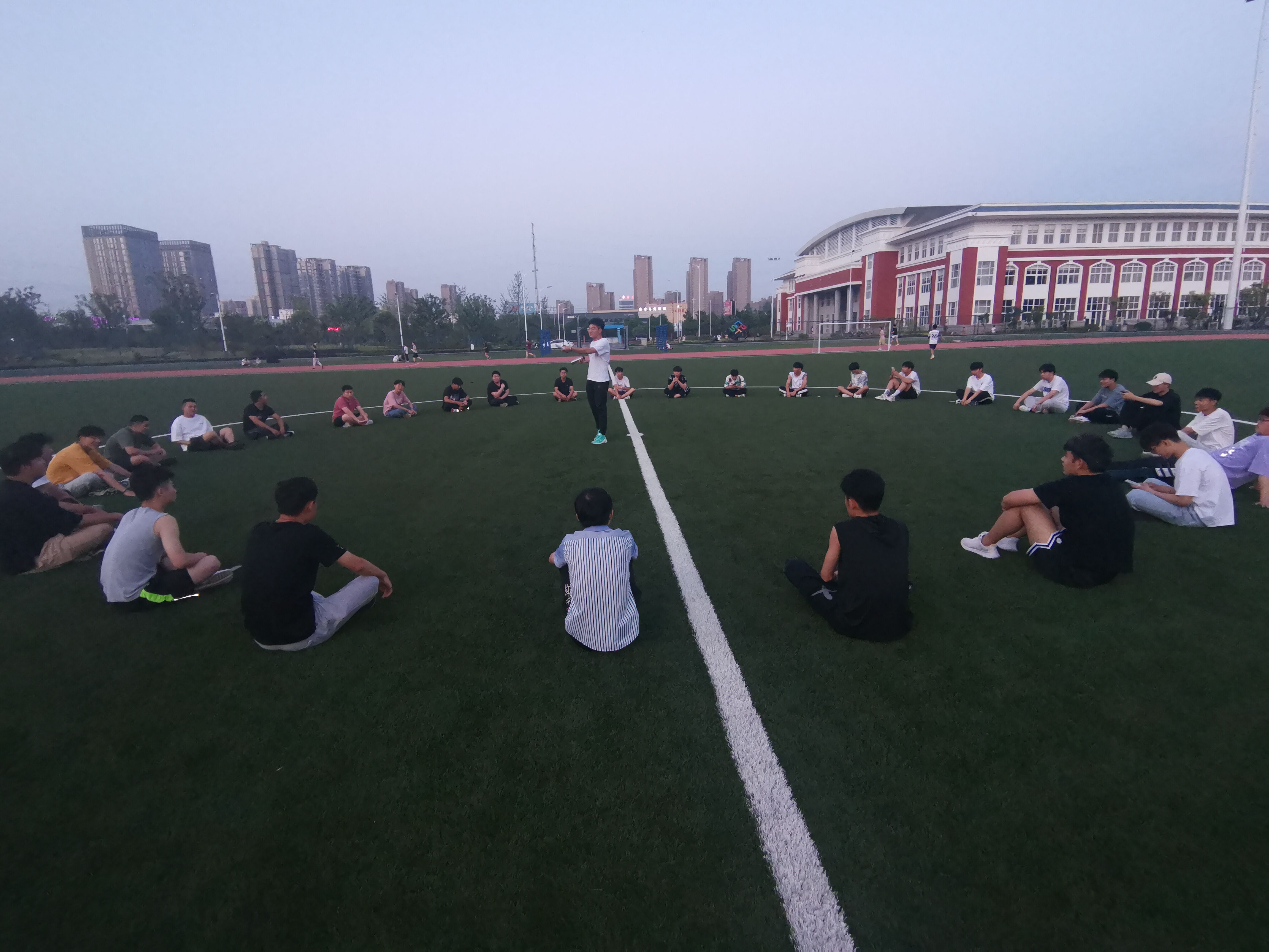 经过前期充分准备与宣传,活动现场不仅有我院团学干,更有慕名而来参观的其他学院的同学。在晚霞的陪伴下活动开始,首先由同学们手拉手围成一个大圆圈进行自我介绍,随后介绍游戏项目与规则。此次活动选择了丢手绢游戏。操场上充满了欢声笑语,大二学生干部带头参加更让现场活动气氛进一步引向高潮。