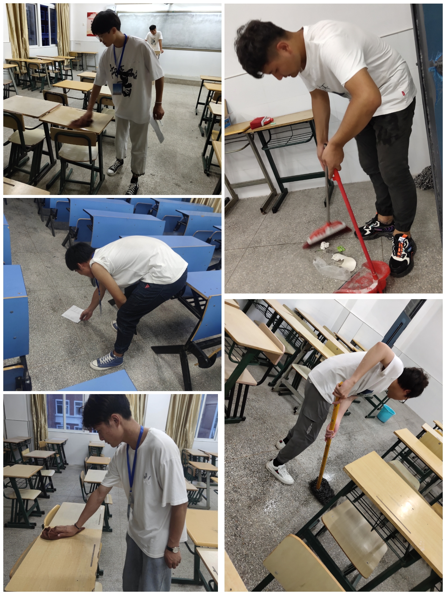 活动伊始,各部门成员和各班级学生自带扫把、水桶、抹布及垃圾袋,发扬不怕脏、不怕累,不怕苦的精神,大家分工明细,干劲十足,每个部门配合各班级打扫提前分配好的教室,有的扫地,有的拖地,还有的抹窗户玻璃,相互配合,最后顺利的完成了此次教学楼教室的清扫活动。