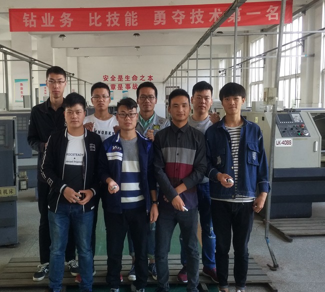 2017年10月28日金沙威尼斯欢乐娱人城科技创新节暨第三届技能大赛数控车项目(汽车系)在金沙威尼斯欢乐娱人城一号数控项目化车间开幕。此次大赛为个人赛,共计三小时,有14名相关专业的优秀学生选手报名参加。图为参赛代表合影。