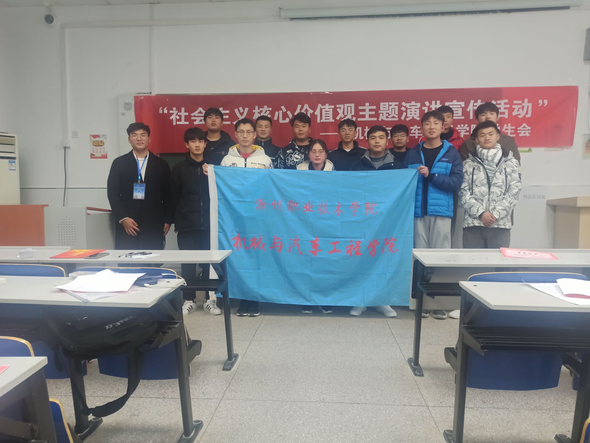 2020年12月24日星期四晚上,机械与汽车工程学院在教学楼5113教室开展“社会主义核心价值观”主题宣传演讲活动。本次活动由机械与汽车工程学院学生会承办,机械与汽车工程学院学生会干事卢宇航同学担任活动主持人,机械与汽车工程学院团学干事徐晓龙,余学远,梁瀚允,黄鹏飞担任活动评委,参加比赛的选手为2020级各班级代表。